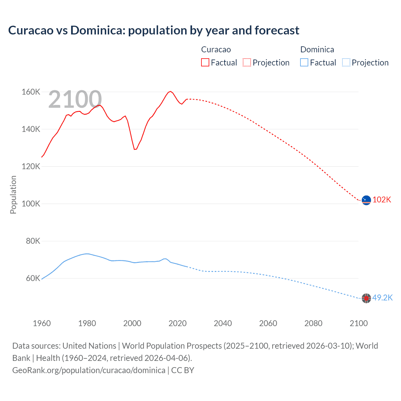 Curacao vs Dominica: population by year and forecast