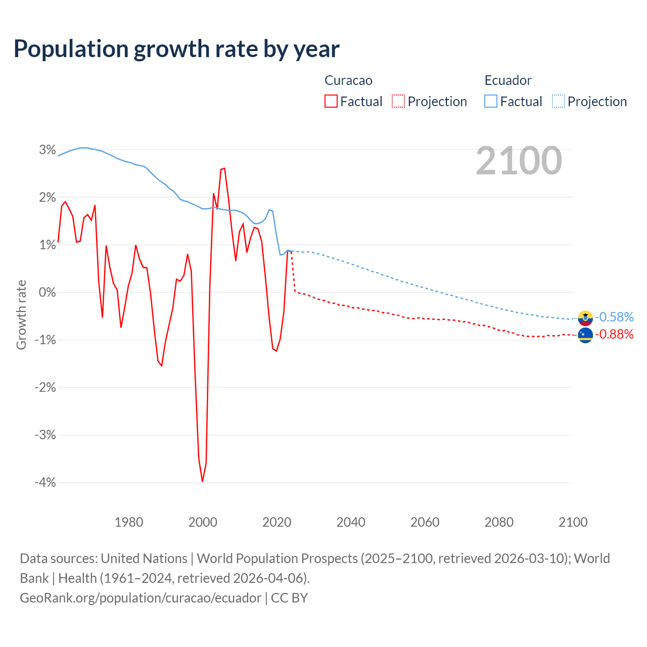 - For the last 10 years, Curacao has had an average growth rate of +0.13% per year vs +1.26% in Ecuador.