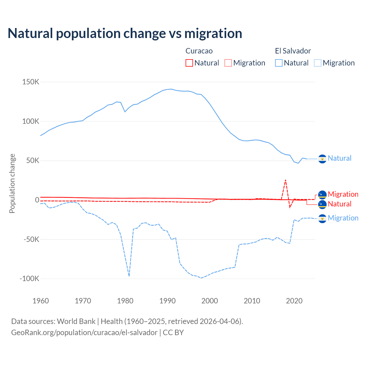 Over the last 10 years, 3.72% of the population change in Curacao is from natural causes (a gain of 834 people) and 96.3% is from migration (a gain of 21,615 people). In El Salvador 58.8% is from natural causes (a gain of 579,641 people) and 41.2% is from migration (a loss of 406,874 people).