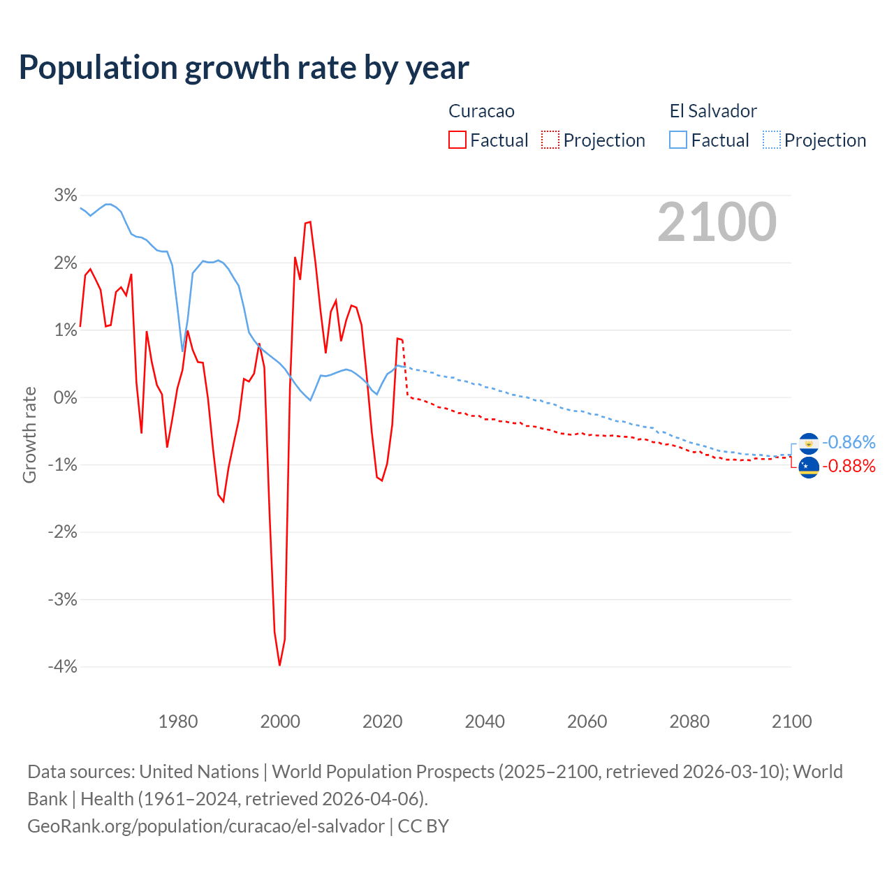- For the last 10 years, Curacao has had an average growth rate of +0.13% per year vs +0.29% in El Salvador.