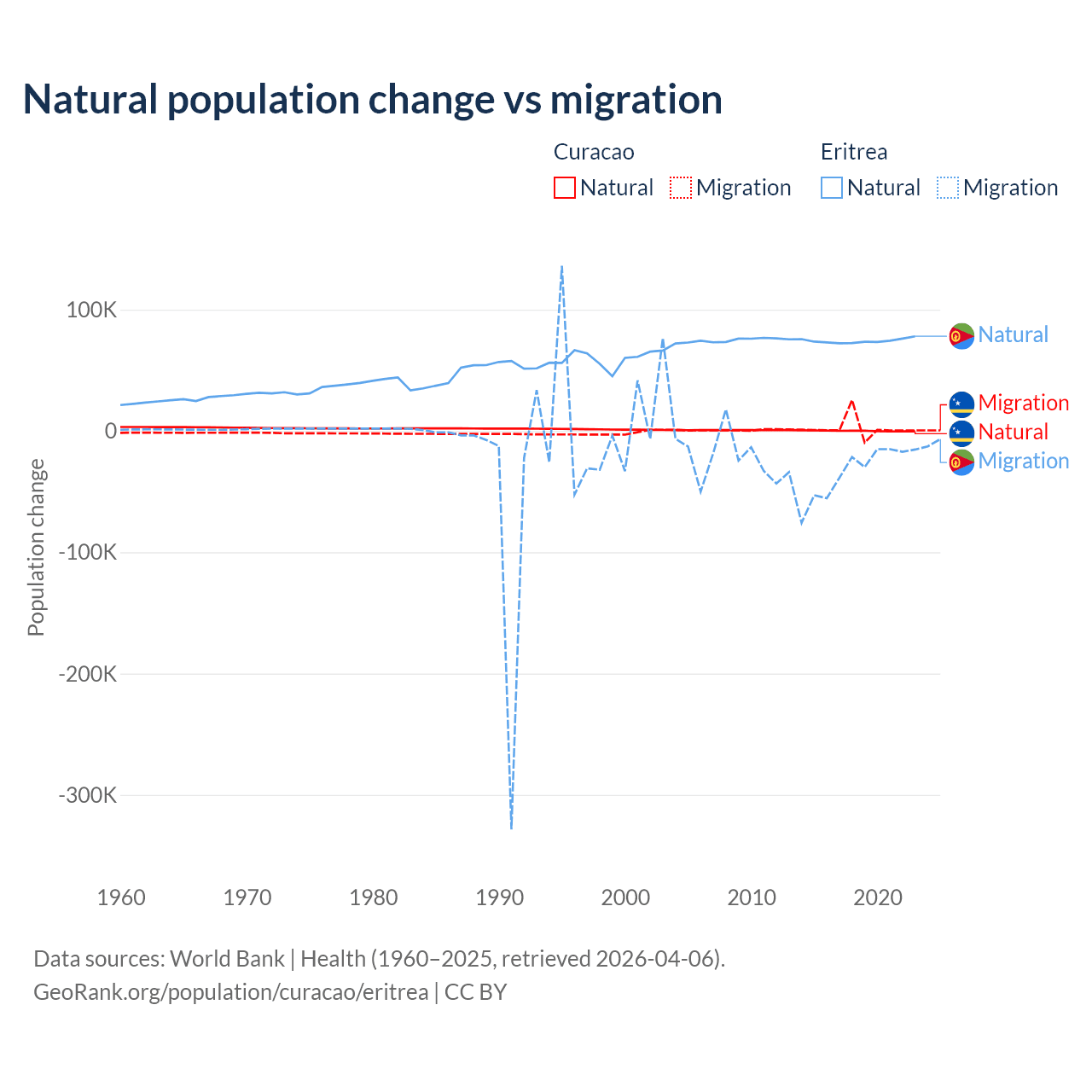 Over the last 10 years, 3.72% of the population change in Curacao is from natural causes (a gain of 834 people) and 96.3% is from migration (a gain of 21,615 people). In Eritrea 68.8% is from natural causes (a gain of 742,837 people) and 31.2% is from migration (a loss of 336,243 people).
