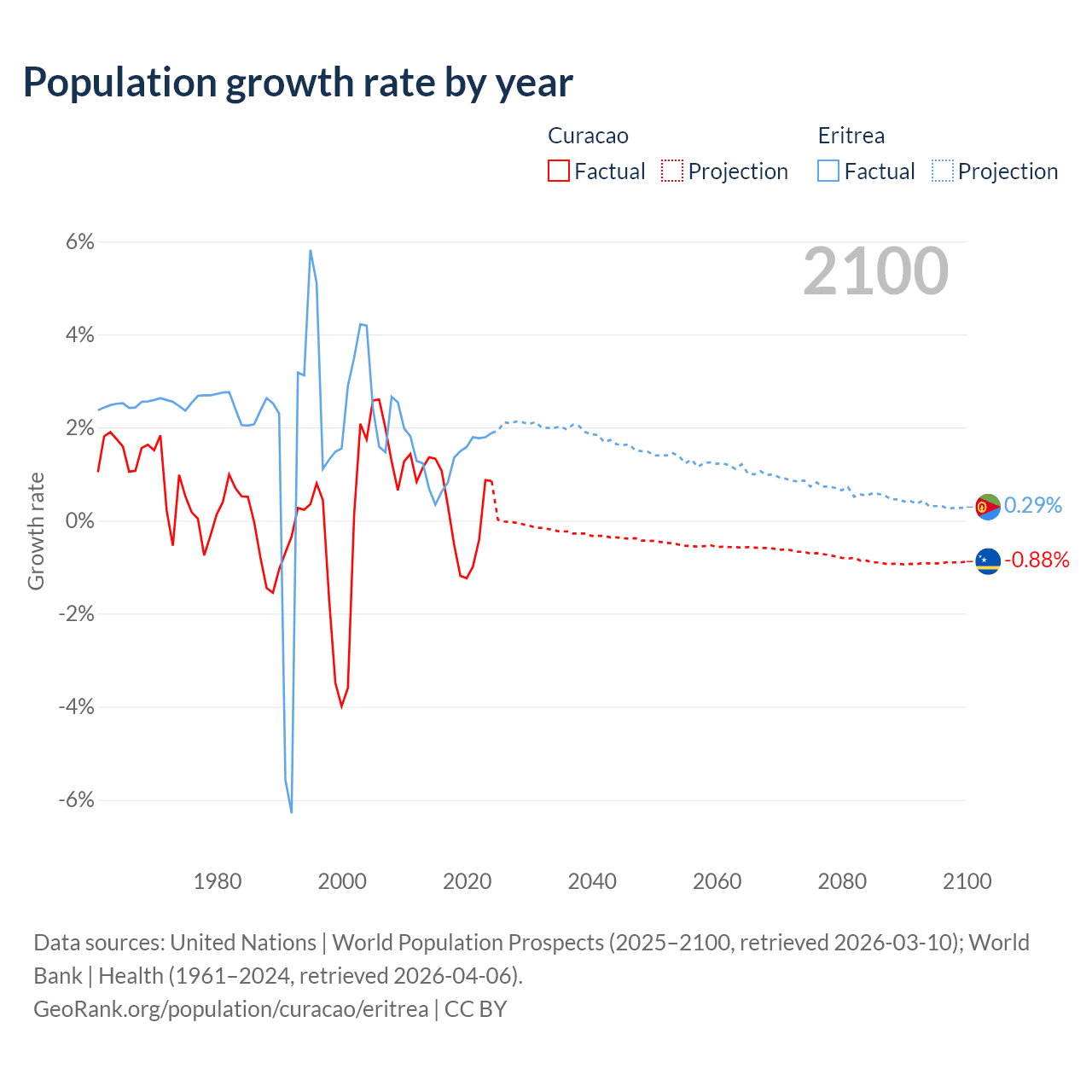 - For the last 10 years, Curacao has had an average growth rate of +0.13% per year vs +1.28% in Eritrea.