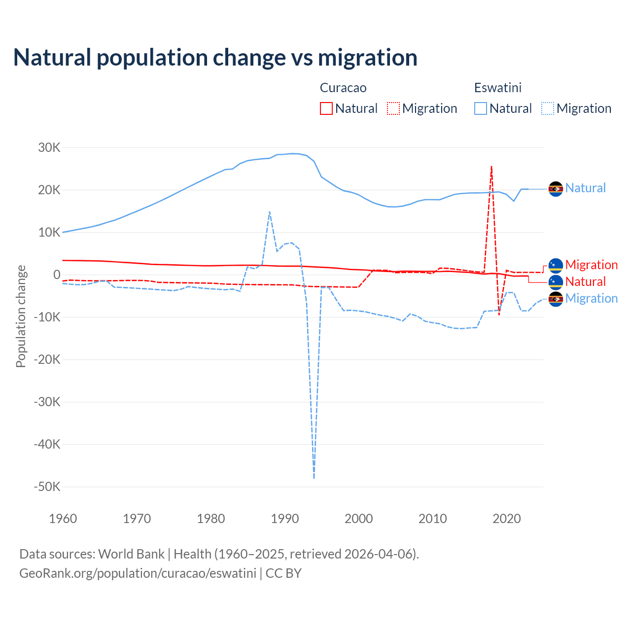 Over the last 10 years, 3.72% of the population change in Curacao is from natural causes (a gain of 834 people) and 96.3% is from migration (a gain of 21,615 people). In Eswatini 68.3% is from natural causes (a gain of 192,206 people) and 31.7% is from migration (a loss of 89,012 people).