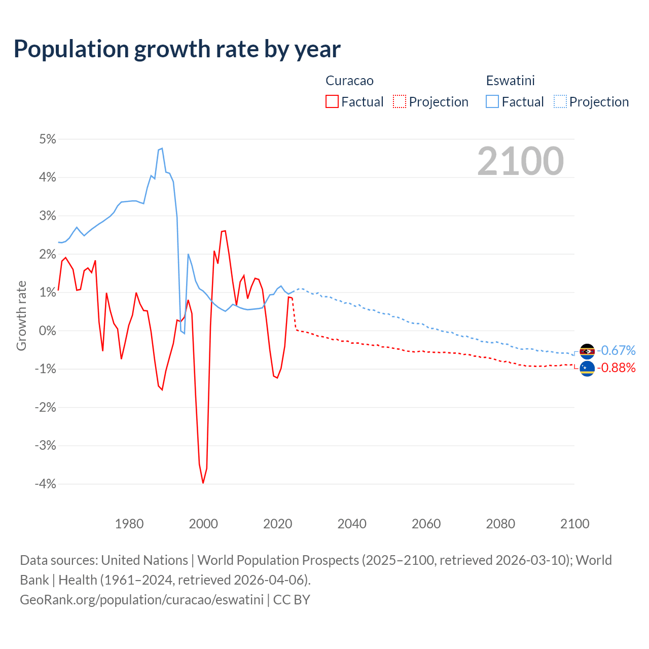 - For the last 10 years, Curacao has had an average growth rate of +0.13% per year vs +0.87% in Eswatini.
