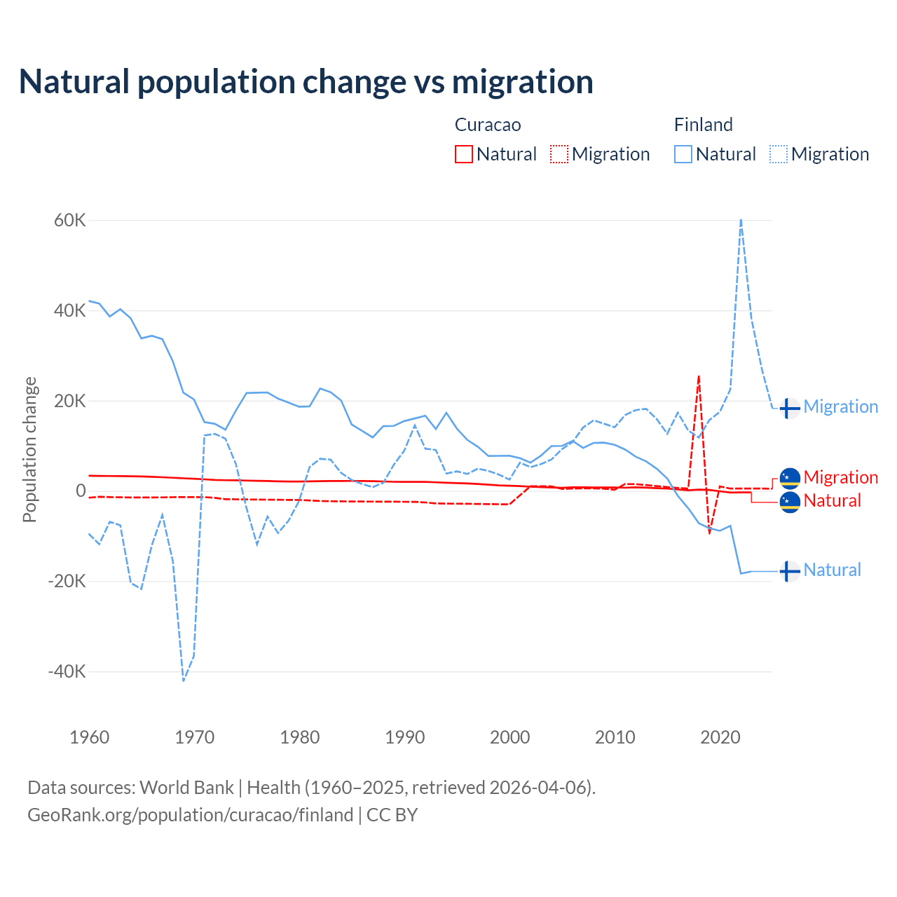Over the last 10 years, 3.72% of the population change in Curacao is from natural causes (a gain of 834 people) and 96.3% is from migration (a gain of 21,615 people). In Finland 22.5% is from natural causes (a loss of 65,560 people) and 77.5% is from migration (a gain of 225,237 people).