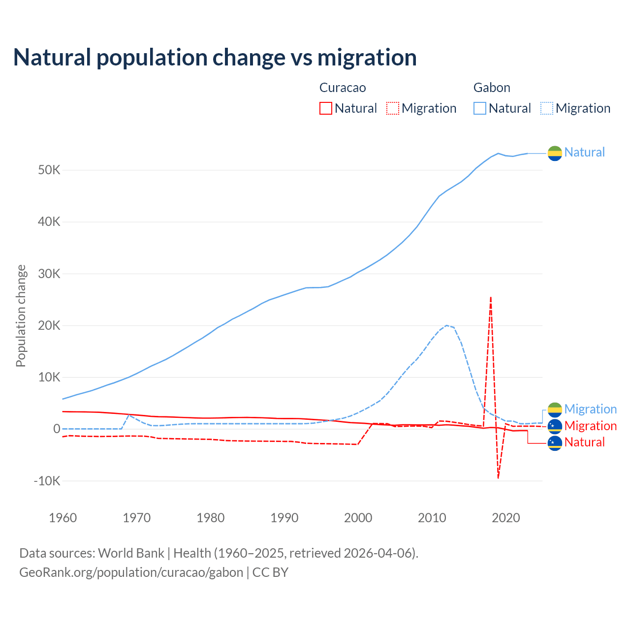 Over the last 10 years, 3.72% of the population change in Curacao is from natural causes (a gain of 834 people) and 96.3% is from migration (a gain of 21,615 people). In Gabon 91.1% is from natural causes (a gain of 515,484 people) and 8.86% is from migration (a gain of 50,119 people).