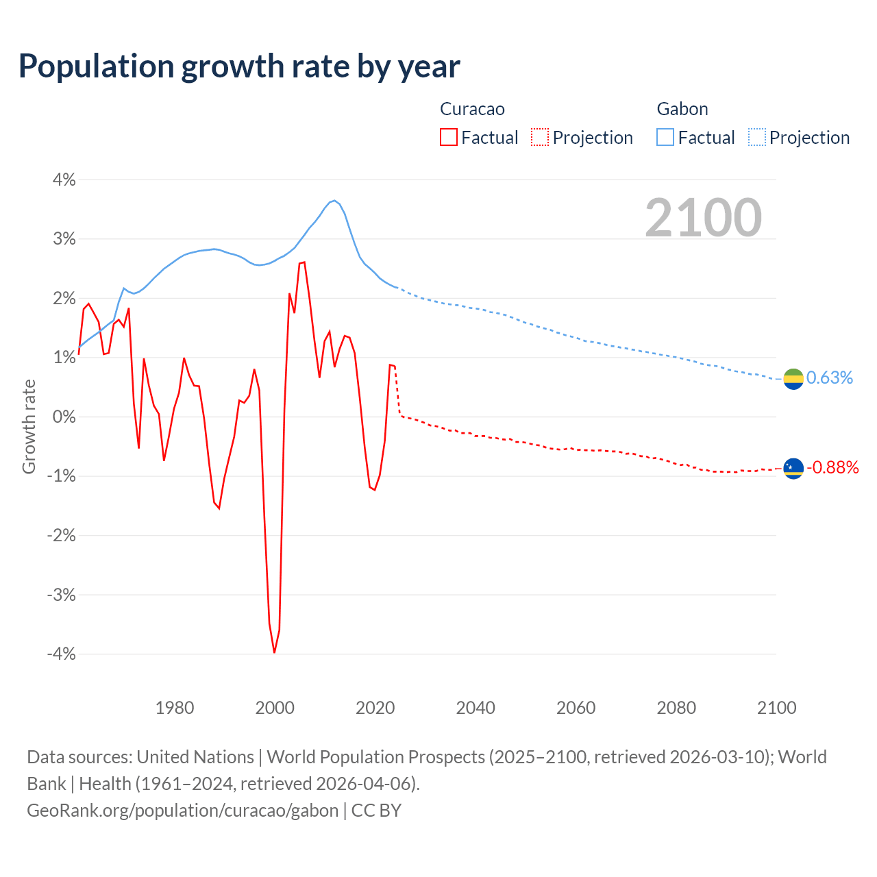 - For the last 10 years, Curacao has had an average growth rate of +0.13% per year vs +2.61% in Gabon.