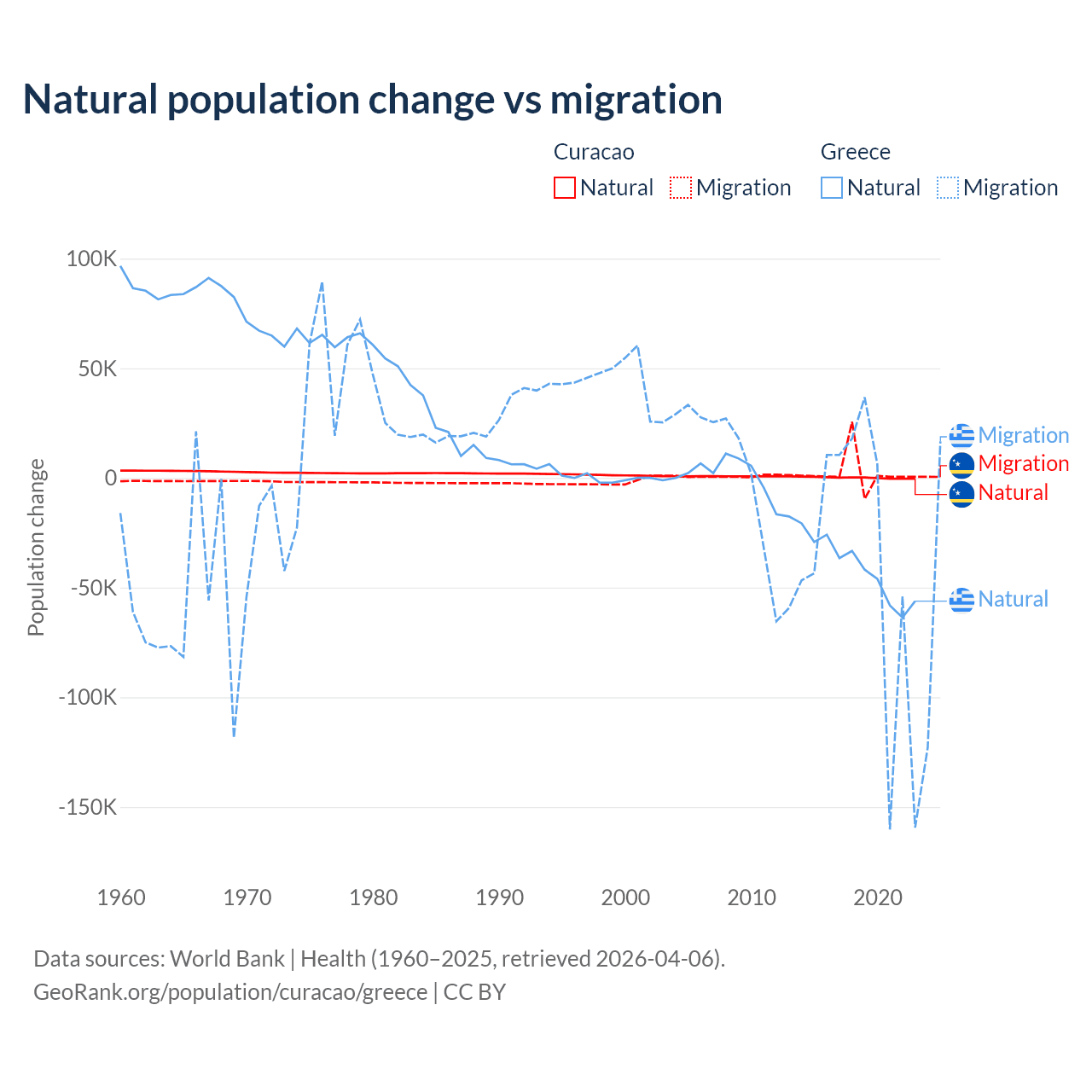 Over the last 10 years, 3.72% of the population change in Curacao is from natural causes (a gain of 834 people) and 96.3% is from migration (a gain of 21,615 people). In Greece 51.9% is from natural causes (a loss of 411,426 people) and 48.1% is from migration (a loss of 381,824 people).