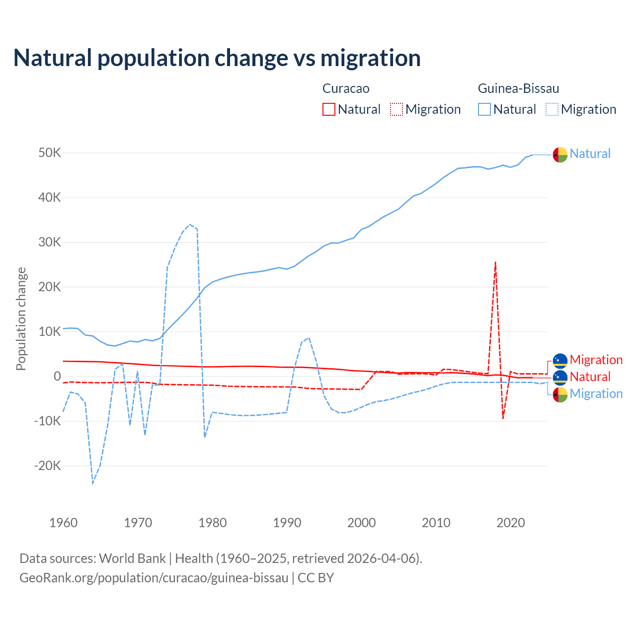 Over the last 10 years, 3.72% of the population change in Curacao is from natural causes (a gain of 834 people) and 96.3% is from migration (a gain of 21,615 people). In Guinea-Bissau 97.1% is from natural causes (a gain of 472,826 people) and 2.87% is from migration (a loss of 13,956 people).