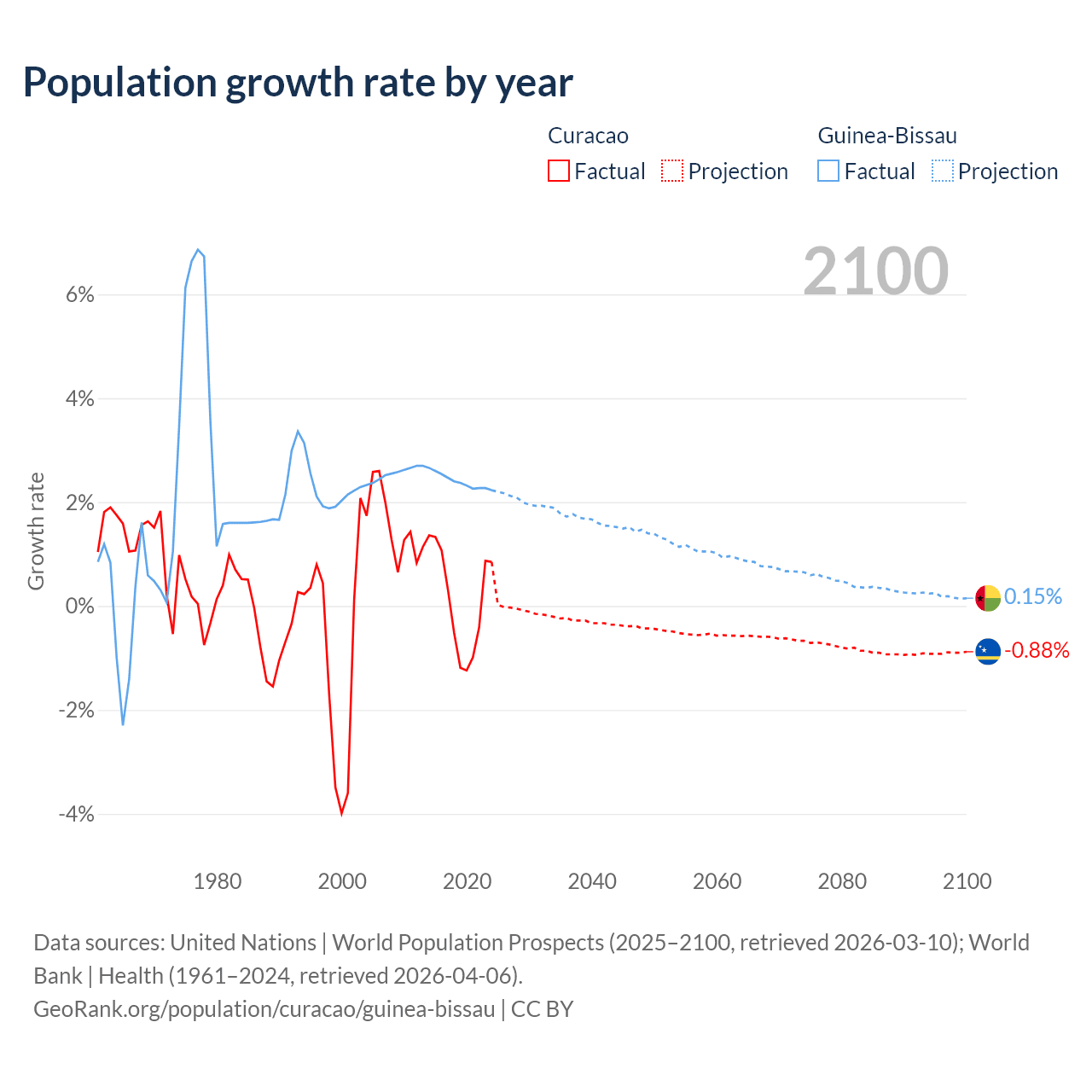 - For the last 10 years, Curacao has had an average growth rate of +0.13% per year vs +2.4% in Guinea-Bissau.