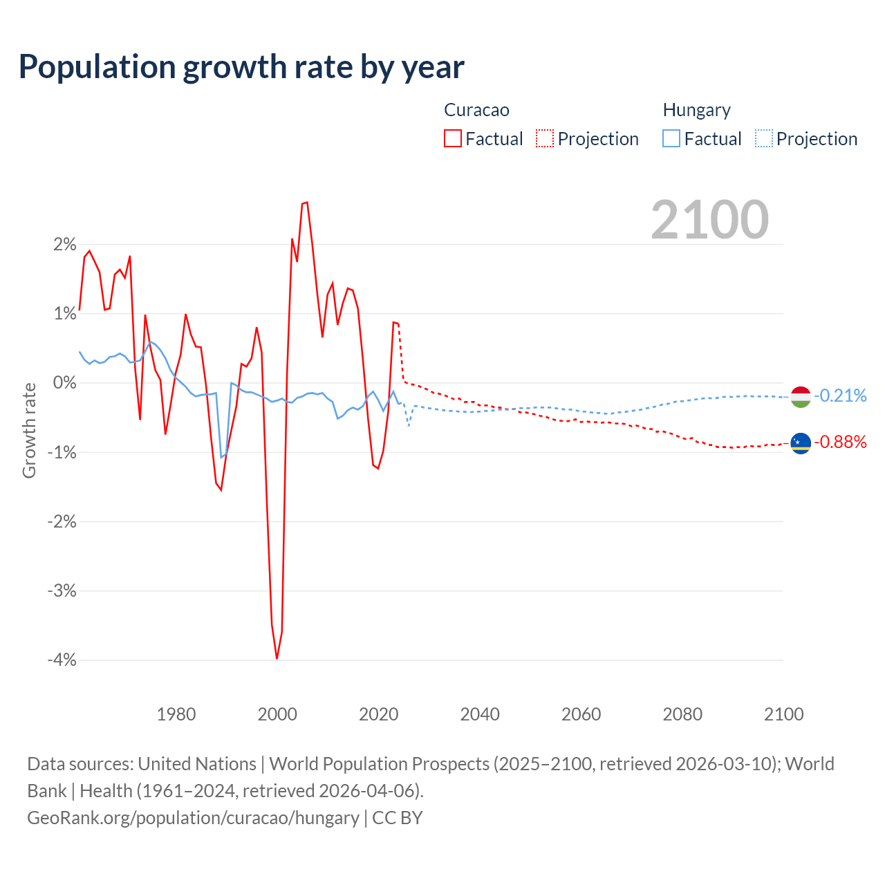 - For the last 10 years, Curacao has had an average growth rate of +0.13% per year vs -0.29% in Hungary.
