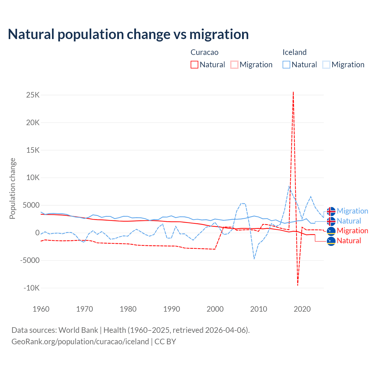 Over the last 10 years, 3.72% of the population change in Curacao is from natural causes (a gain of 834 people) and 96.3% is from migration (a gain of 21,615 people). In Iceland 30.7% is from natural causes (a gain of 20,128 people) and 69.3% is from migration (a gain of 45,356 people).