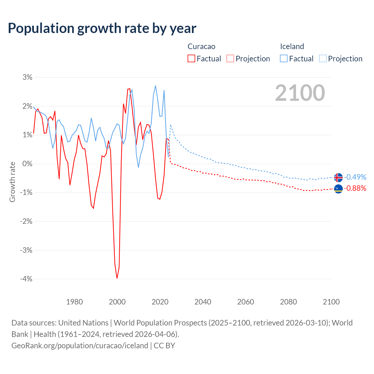 - For the last 10 years, Curacao has had an average growth rate of +0.13% per year vs +1.63% in Iceland.