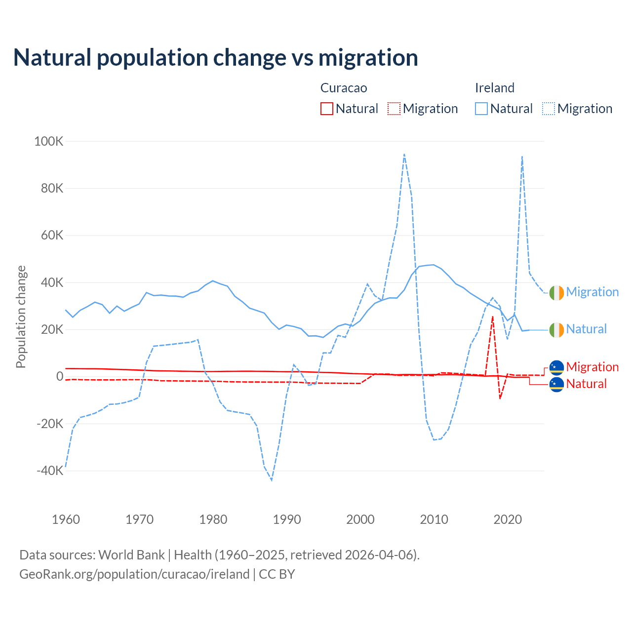 Over the last 10 years, 3.72% of the population change in Curacao is from natural causes (a gain of 834 people) and 96.3% is from migration (a gain of 21,615 people). In Ireland 48.2% is from natural causes (a gain of 284,644 people) and 51.8% is from migration (a gain of 305,297 people).