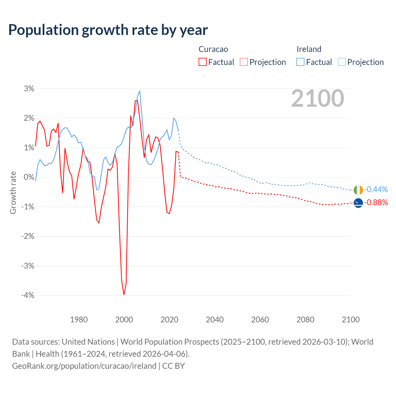 - For the last 10 years, Curacao has had an average growth rate of +0.13% per year vs +1.41% in Ireland.