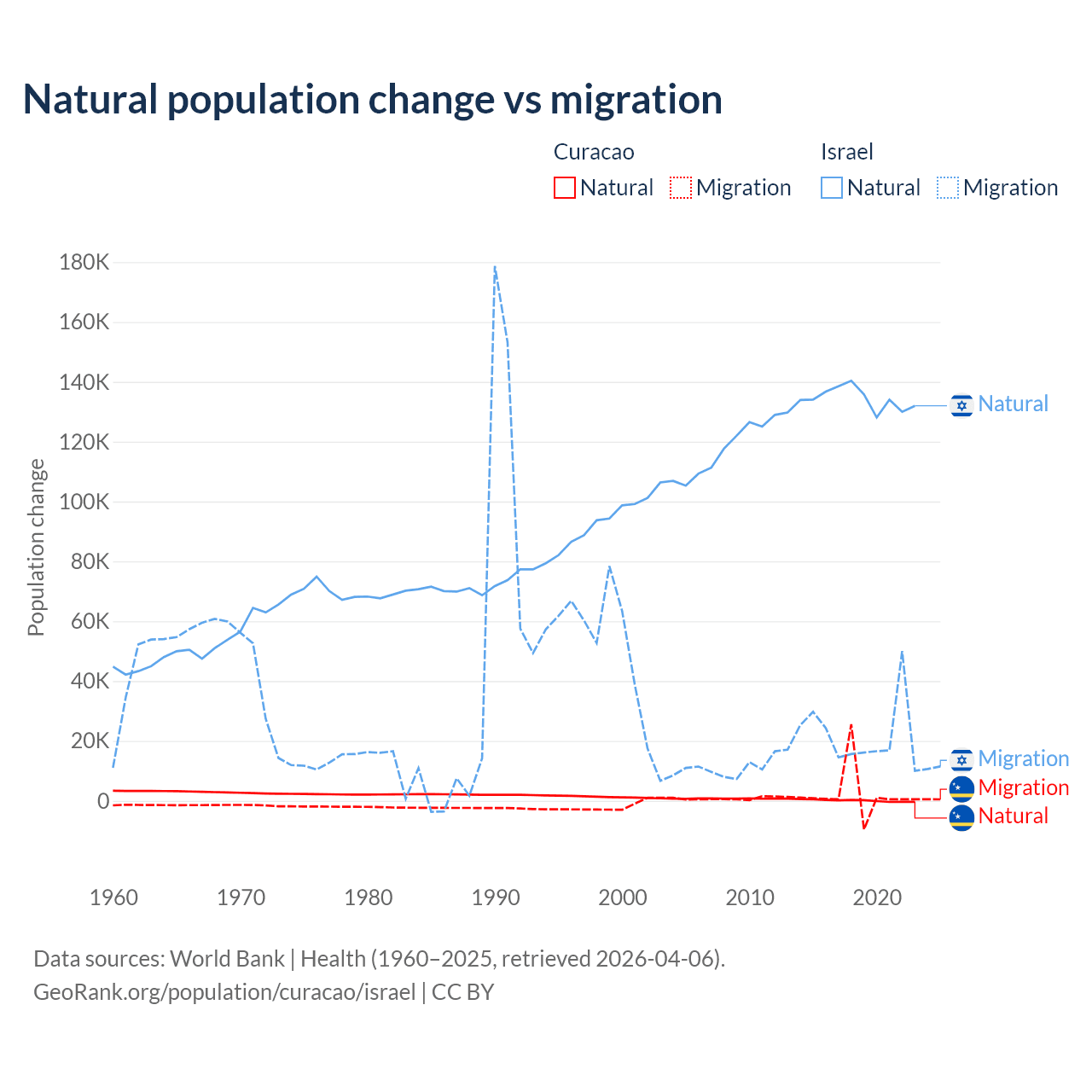 Over the last 10 years, 3.72% of the population change in Curacao is from natural causes (a gain of 834 people) and 96.3% is from migration (a gain of 21,615 people). In Israel 86% is from natural causes (a gain of 1,343,492 people) and 14% is from migration (a gain of 219,048 people).