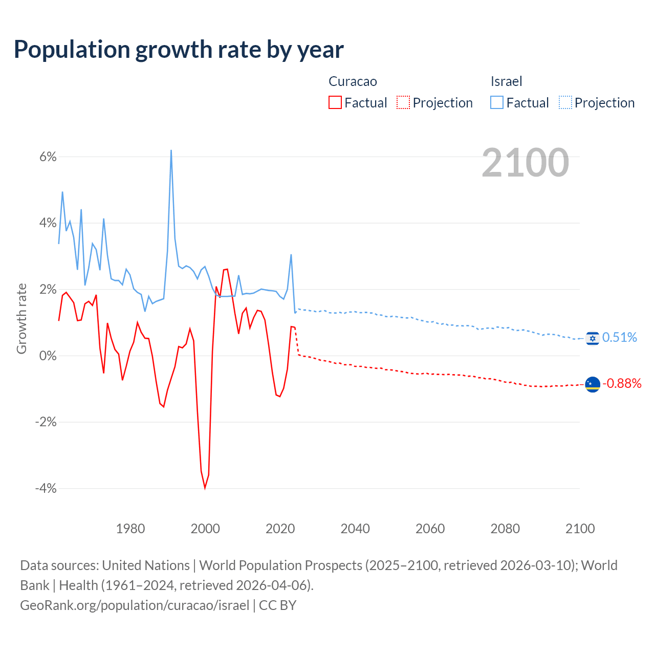 - For the last 10 years, Curacao has had an average growth rate of +0.13% per year vs +1.96% in Israel.
