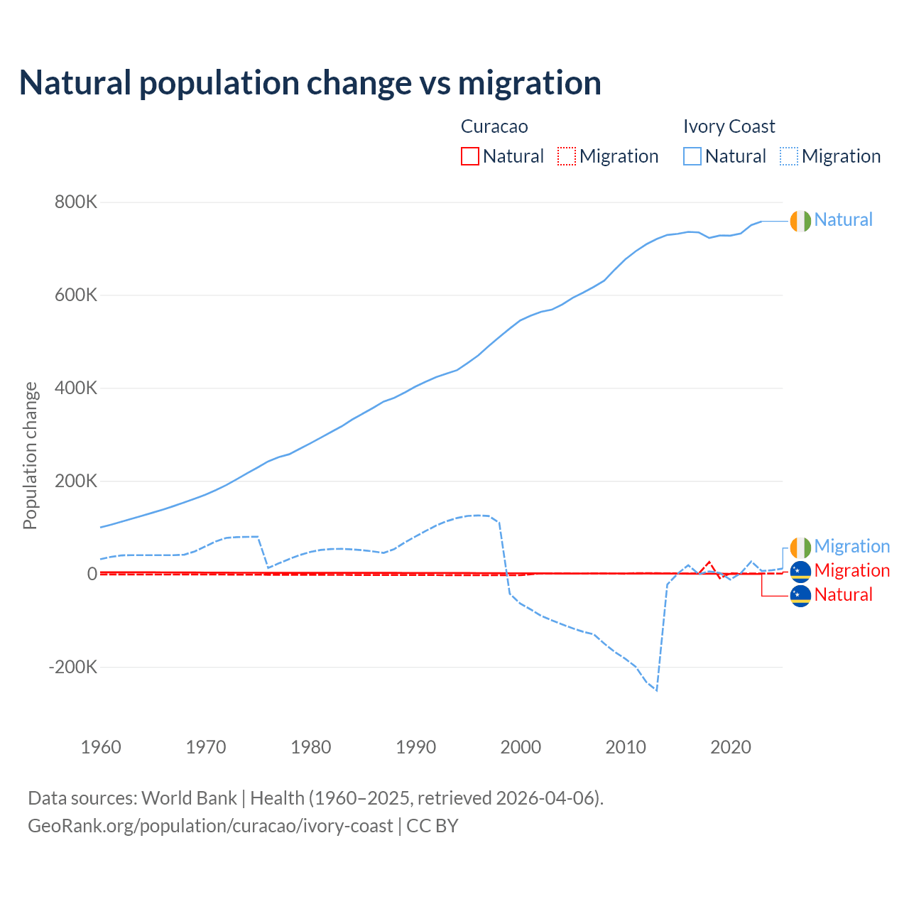 Over the last 10 years, 3.72% of the population change in Curacao is from natural causes (a gain of 834 people) and 96.3% is from migration (a gain of 21,615 people). In Ivory Coast 99.7% is from natural causes (a gain of 7,348,944 people) and 0.33% is from migration (a gain of 24,432 people).