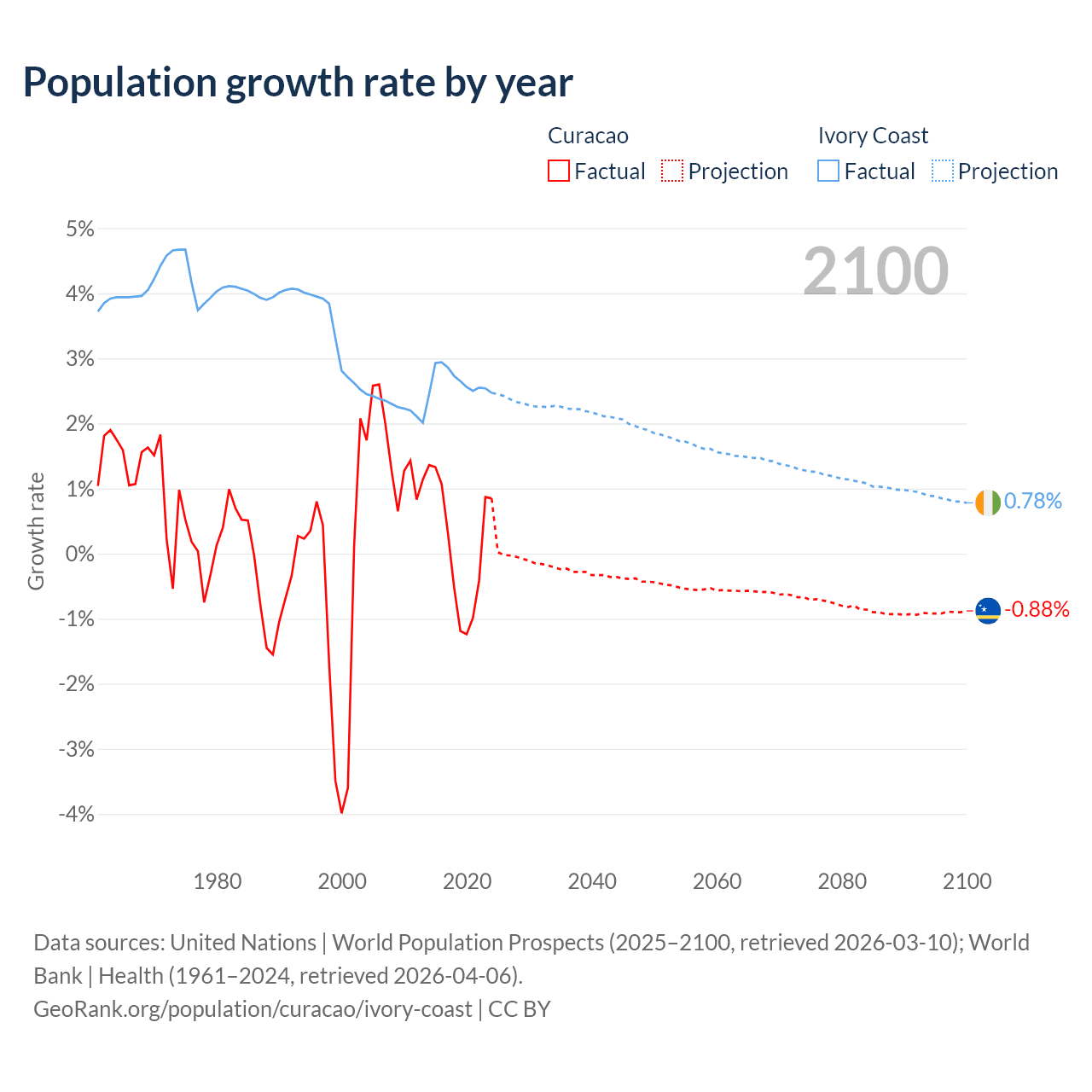 - For the last 10 years, Curacao has had an average growth rate of +0.13% per year vs +2.65% in Ivory Coast.