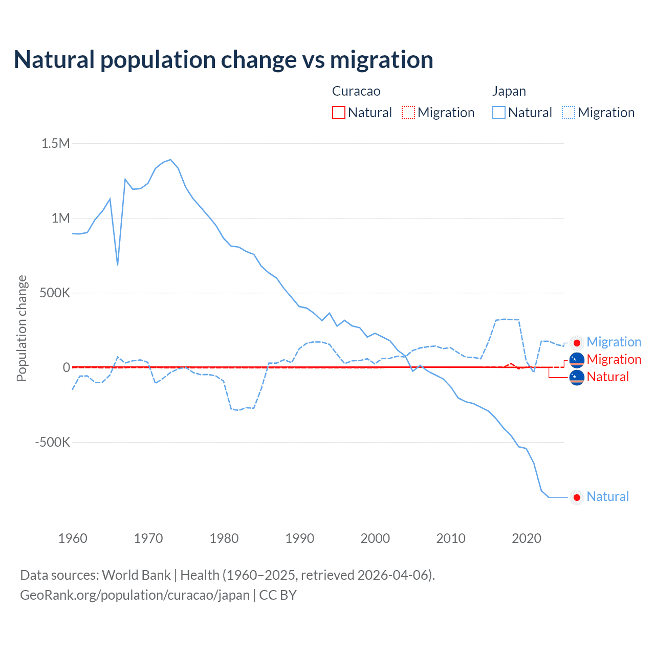 Over the last 10 years, 3.72% of the population change in Curacao is from natural causes (a gain of 834 people) and 96.3% is from migration (a gain of 21,615 people). In Japan 73.6% is from natural causes (a loss of 5,178,838 people) and 26.4% is from migration (a gain of 1,860,103 people).