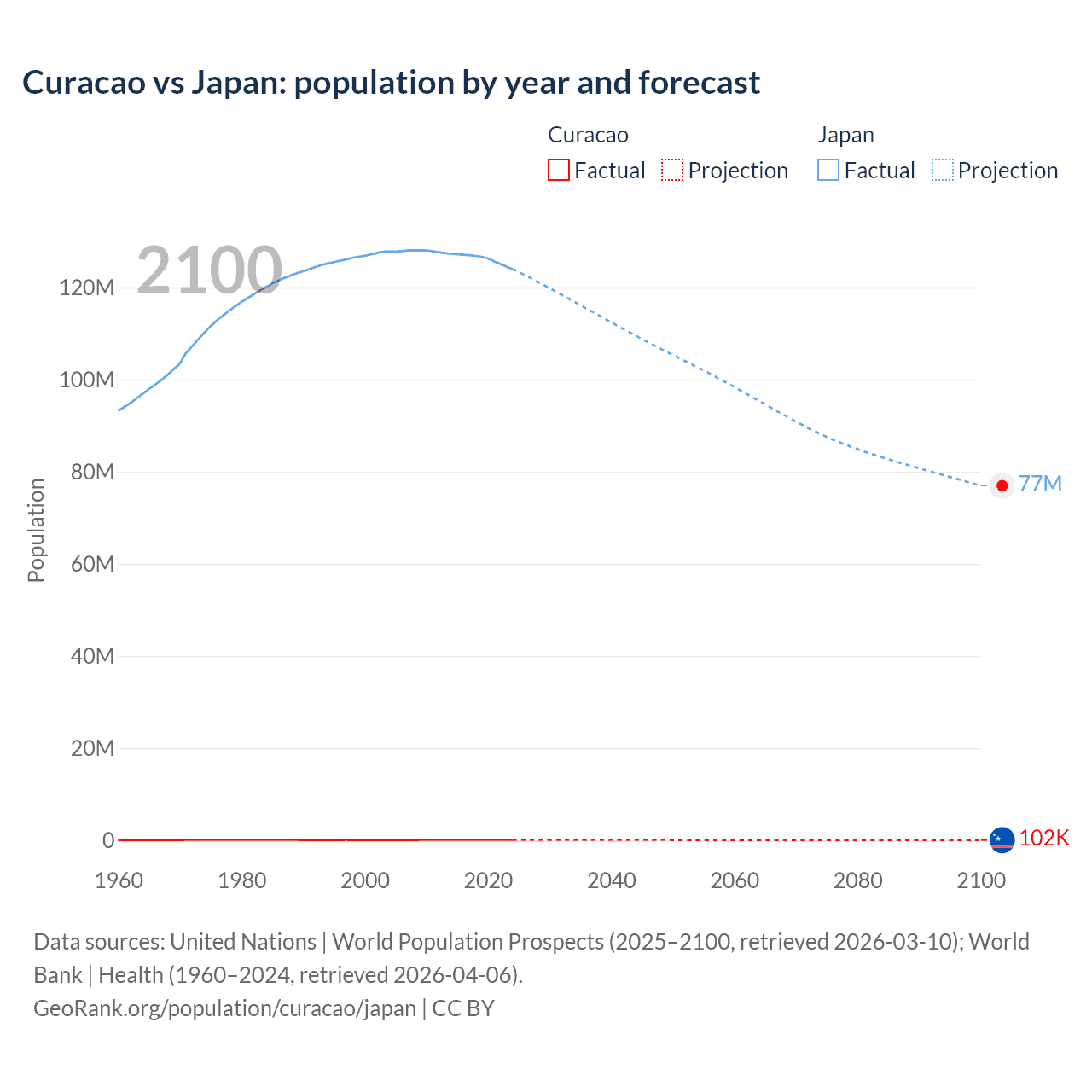 The latest officially reported population of Curacao was 155,967 in 2024 vs 123,975,371 people in Japan in 2024. In 2026, based on the adjusted UN estimation, the current Curacao's population is 155,976 people compared to 122,677,250 in Japan.