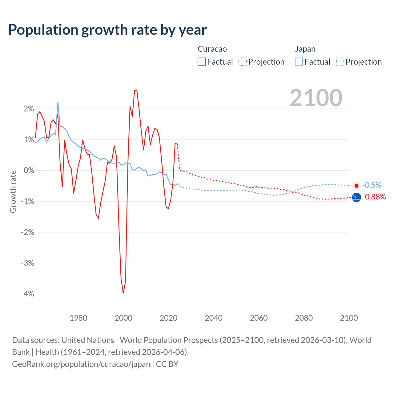 - For the last 10 years, Curacao has had an average growth rate of +0.13% per year vs -0.25% in Japan.