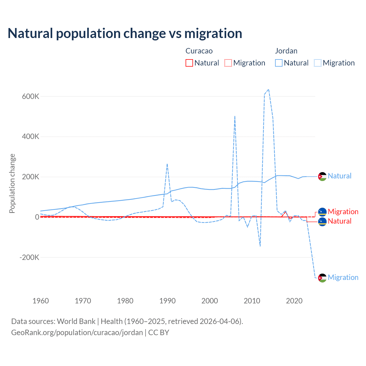 Over the last 10 years, 3.72% of the population change in Curacao is from natural causes (a gain of 834 people) and 96.3% is from migration (a gain of 21,615 people). In Jordan 63.2% is from natural causes (a gain of 1,991,452 people) and 36.8% is from migration (a gain of 1,157,625 people).