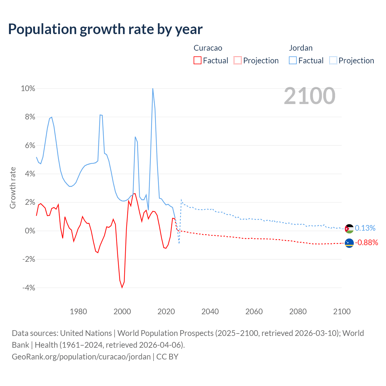 - For the last 10 years, Curacao has had an average growth rate of +0.13% per year vs +3.45% in Jordan.