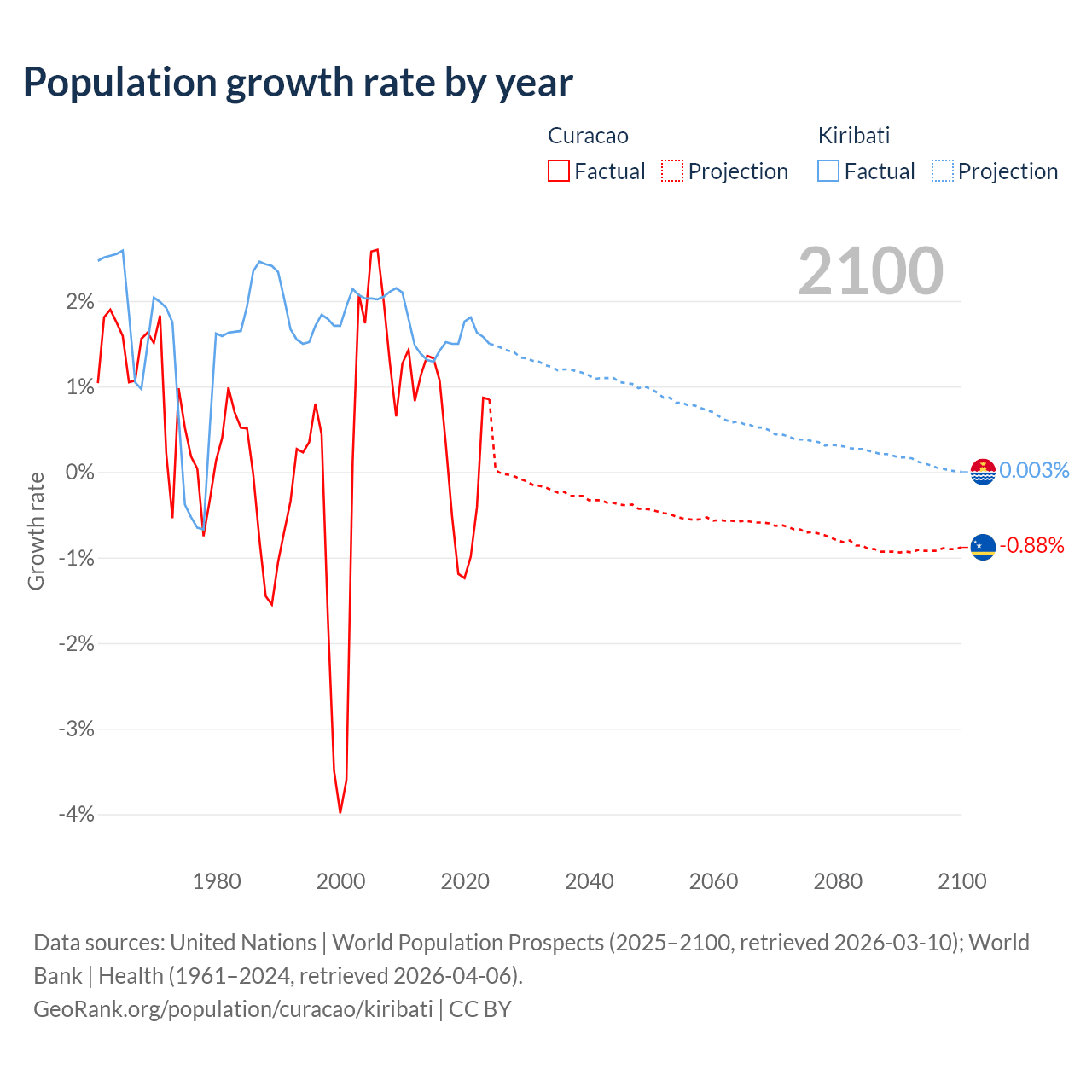 - For the last 10 years, Curacao has had an average growth rate of +0.13% per year vs +1.53% in Kiribati.