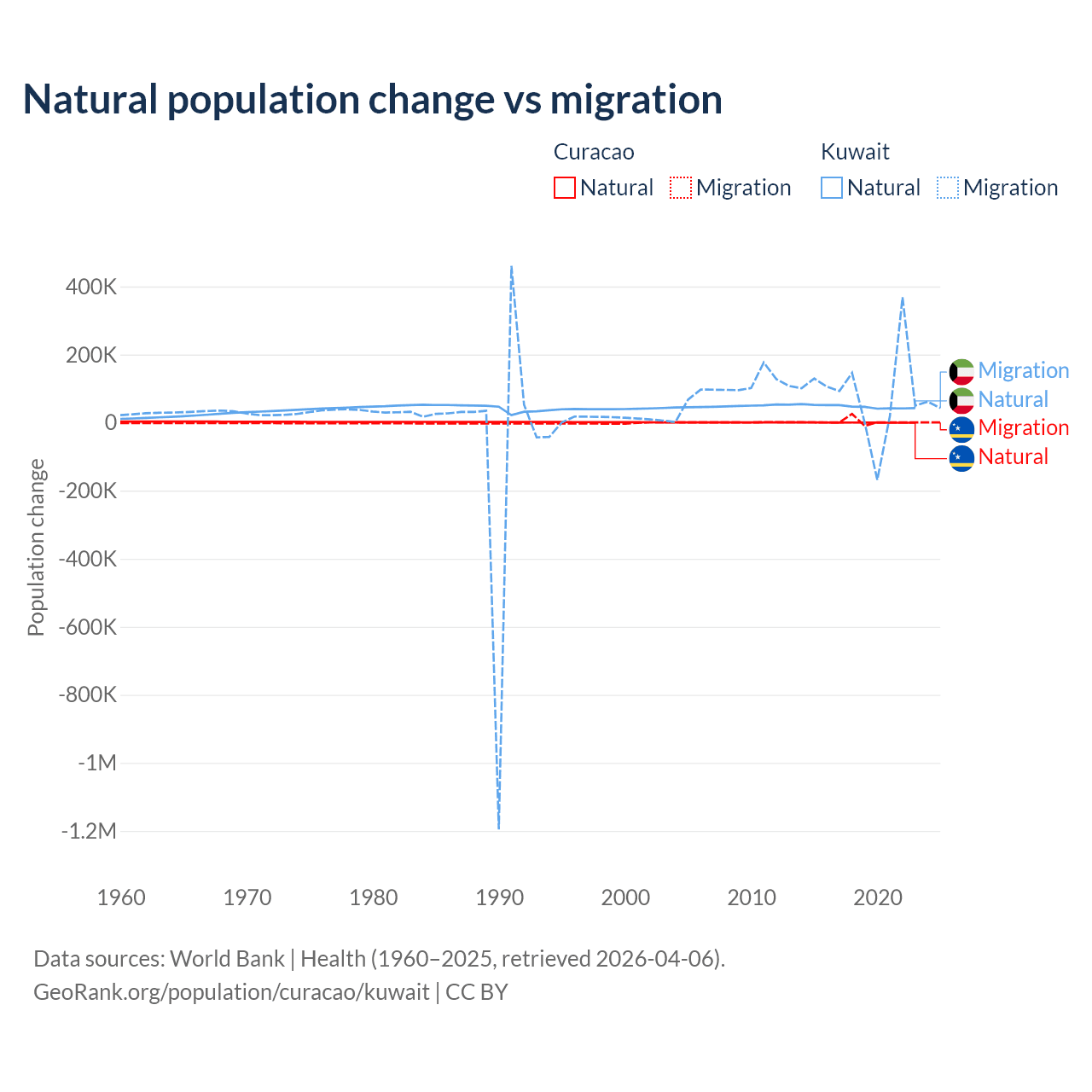 Over the last 10 years, 3.72% of the population change in Curacao is from natural causes (a gain of 834 people) and 96.3% is from migration (a gain of 21,615 people). In Kuwait 35.8% is from natural causes (a gain of 470,645 people) and 64.2% is from migration (a gain of 845,142 people).
