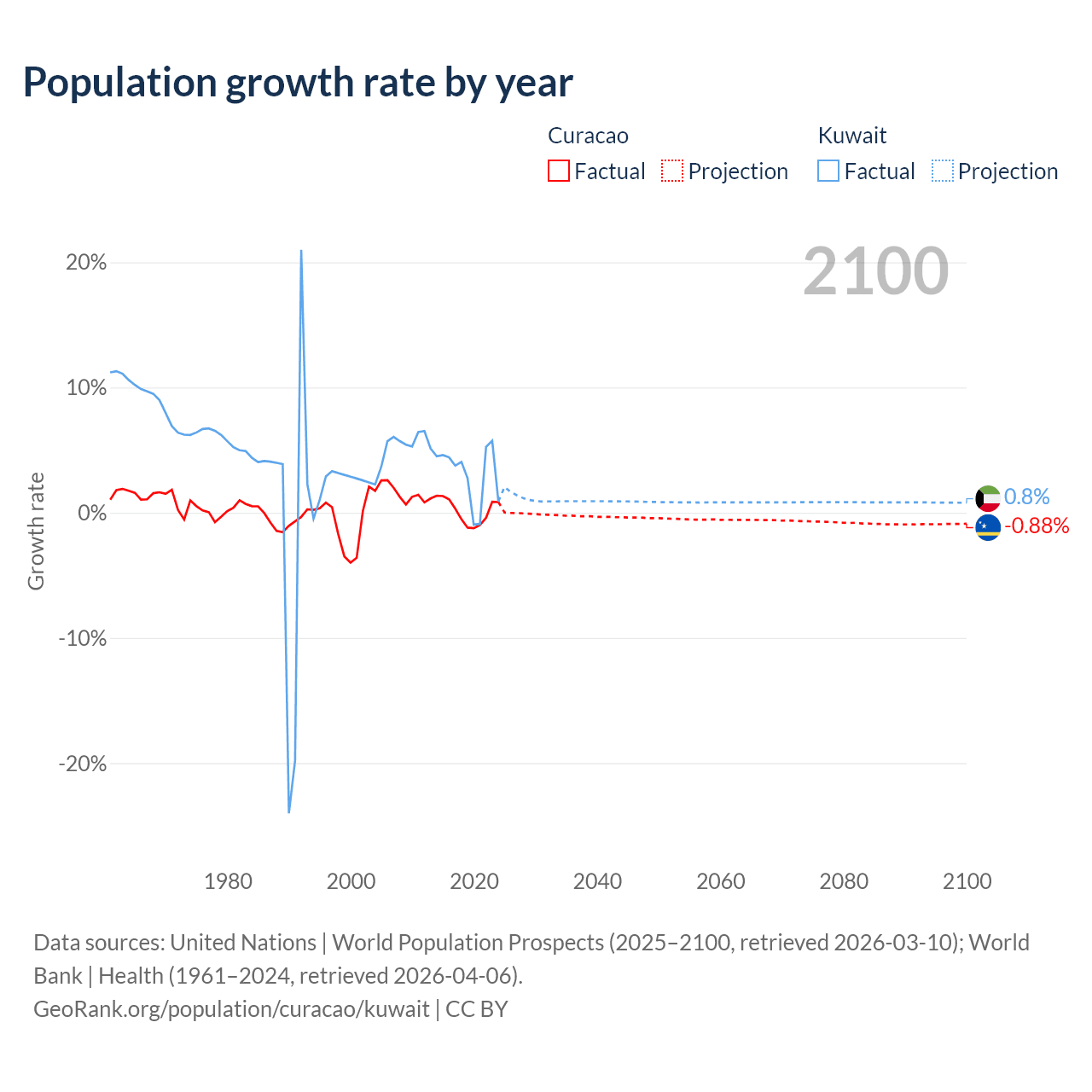- For the last 10 years, Curacao has had an average growth rate of +0.13% per year vs +3.1% in Kuwait.