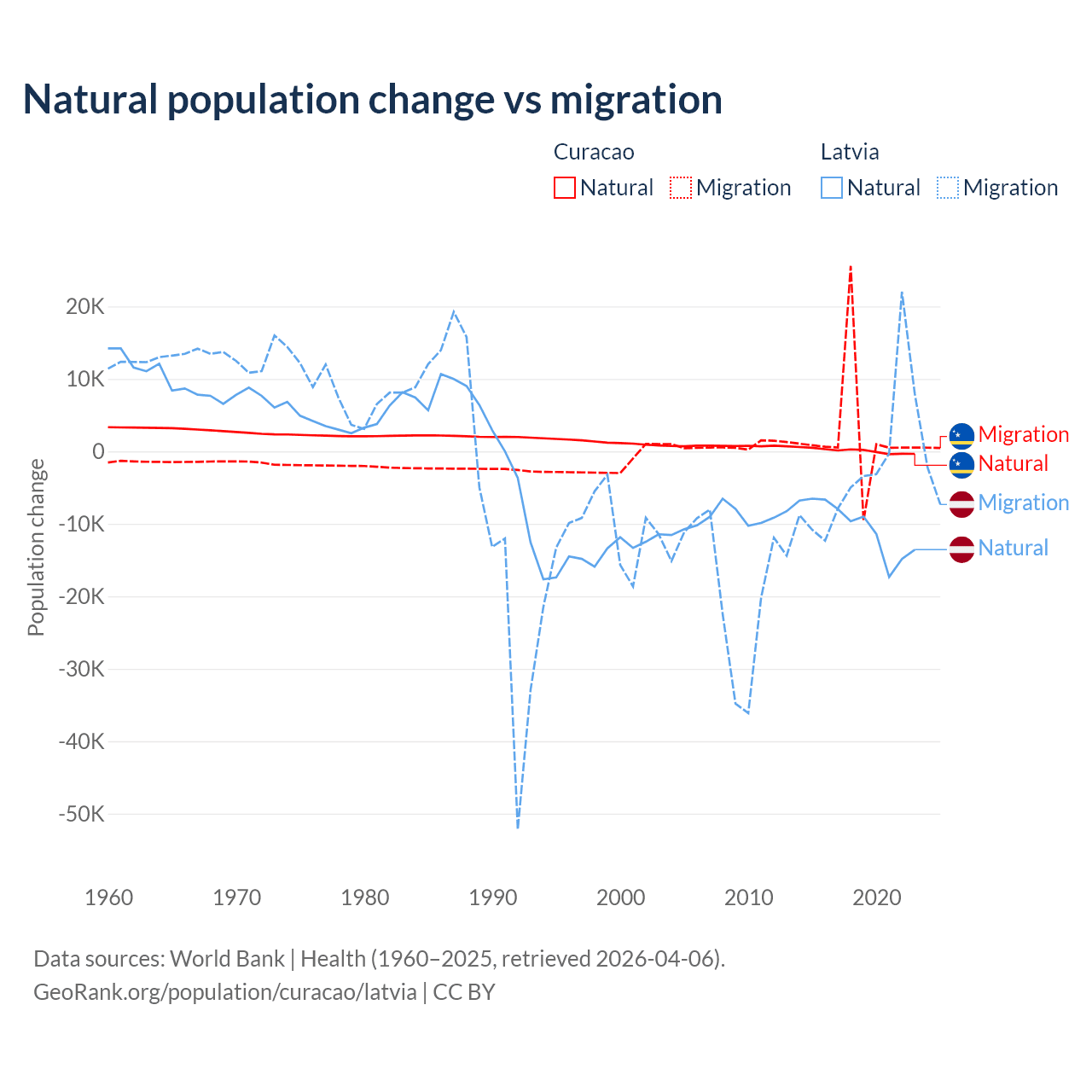 Over the last 10 years, 3.72% of the population change in Curacao is from natural causes (a gain of 834 people) and 96.3% is from migration (a gain of 21,615 people). In Latvia 82.7% is from natural causes (a loss of 103,711 people) and 17.3% is from migration (a loss of 21,641 people).