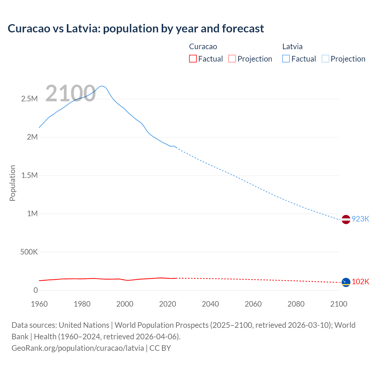 - Since 2006, the population of Curacao has increased from 141K people to 156K (10.4% growth), while Latvia has declined from 2.22M to 1.83M (17.5% decline).