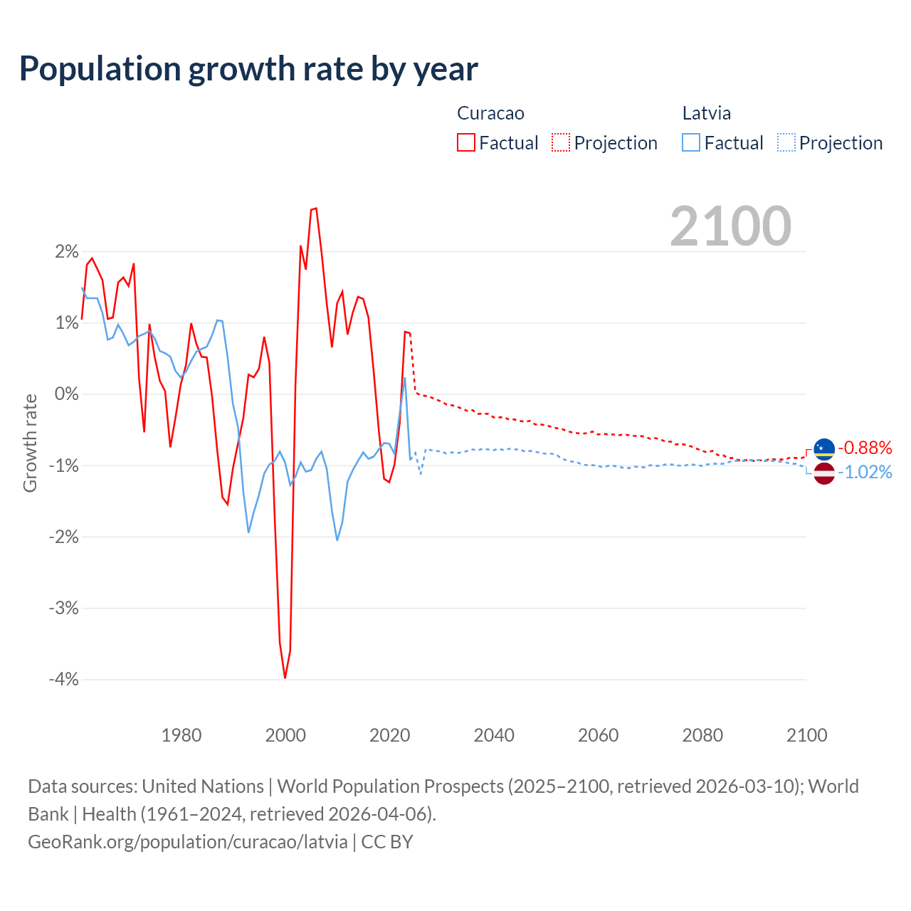 - For the last 10 years, Curacao has had an average growth rate of +0.13% per year vs -0.68% in Latvia.