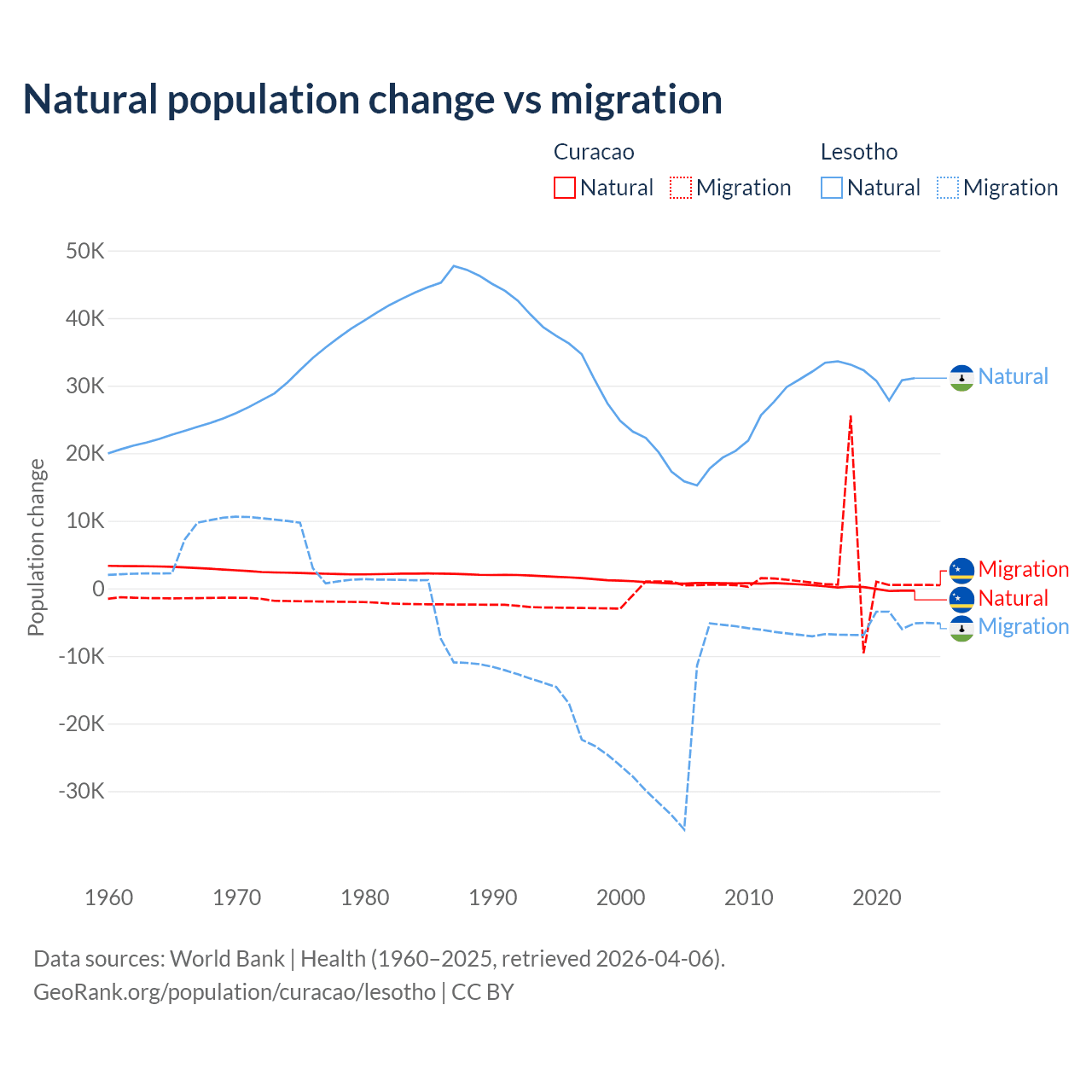 Over the last 10 years, 3.72% of the population change in Curacao is from natural causes (a gain of 834 people) and 96.3% is from migration (a gain of 21,615 people). In Lesotho 84.2% is from natural causes (a gain of 315,836 people) and 15.8% is from migration (a loss of 59,457 people).