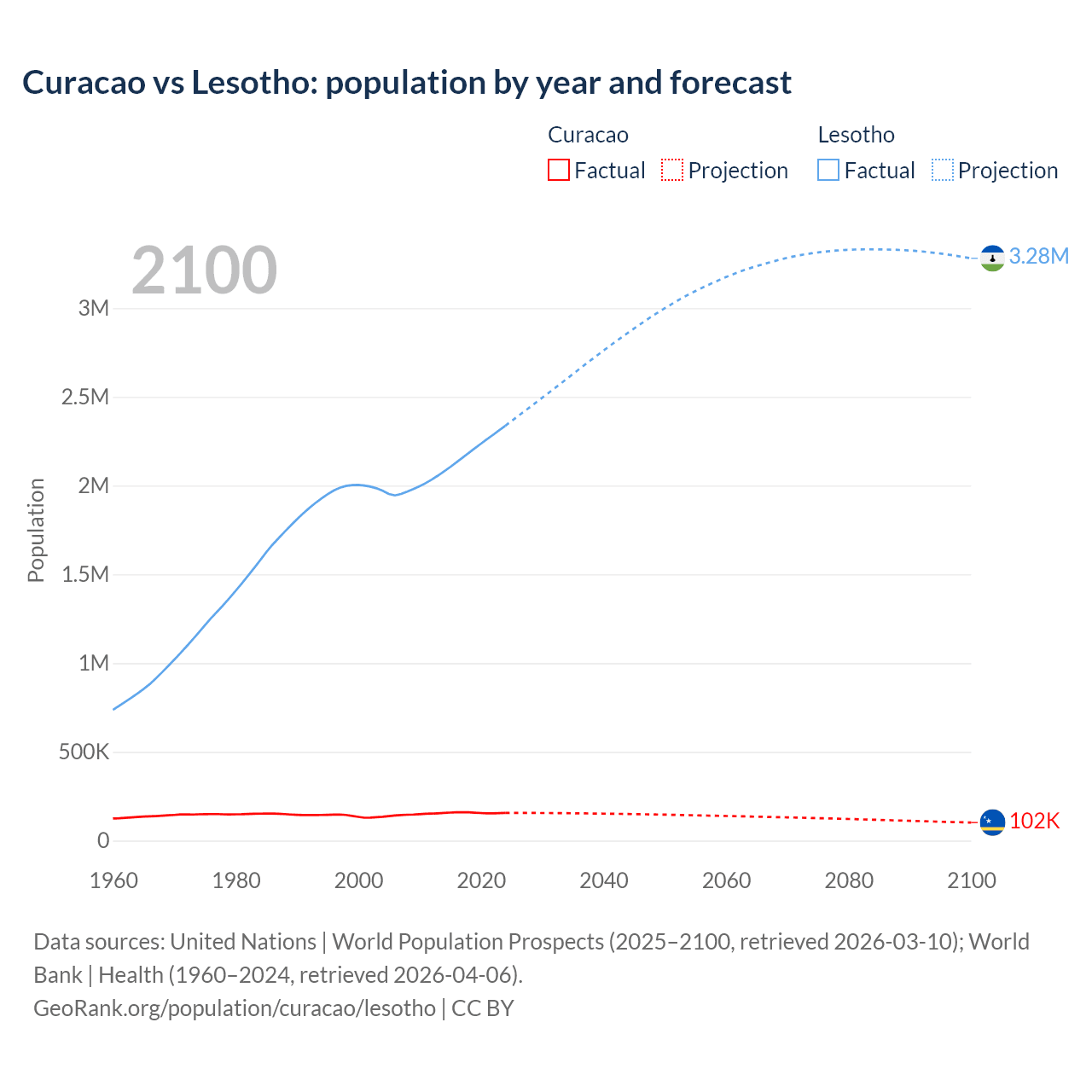 Curacao vs Lesotho: population by year and forecast