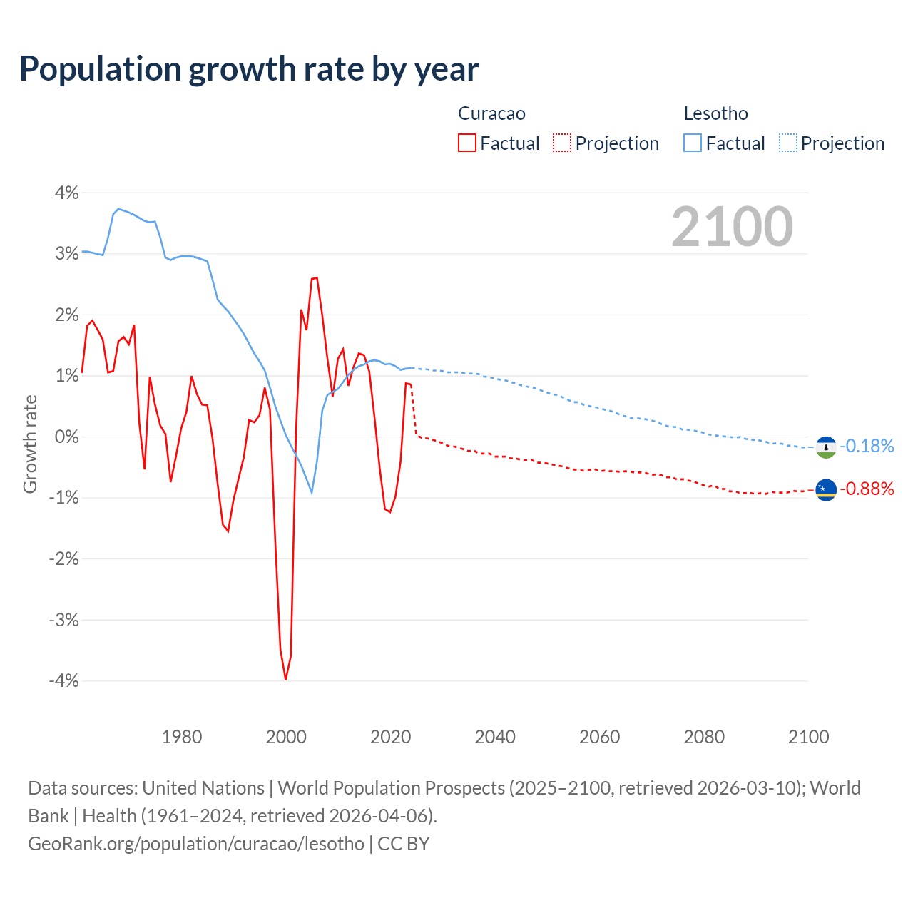 - For the last 10 years, Curacao has had an average growth rate of +0.13% per year vs +1.17% in Lesotho.