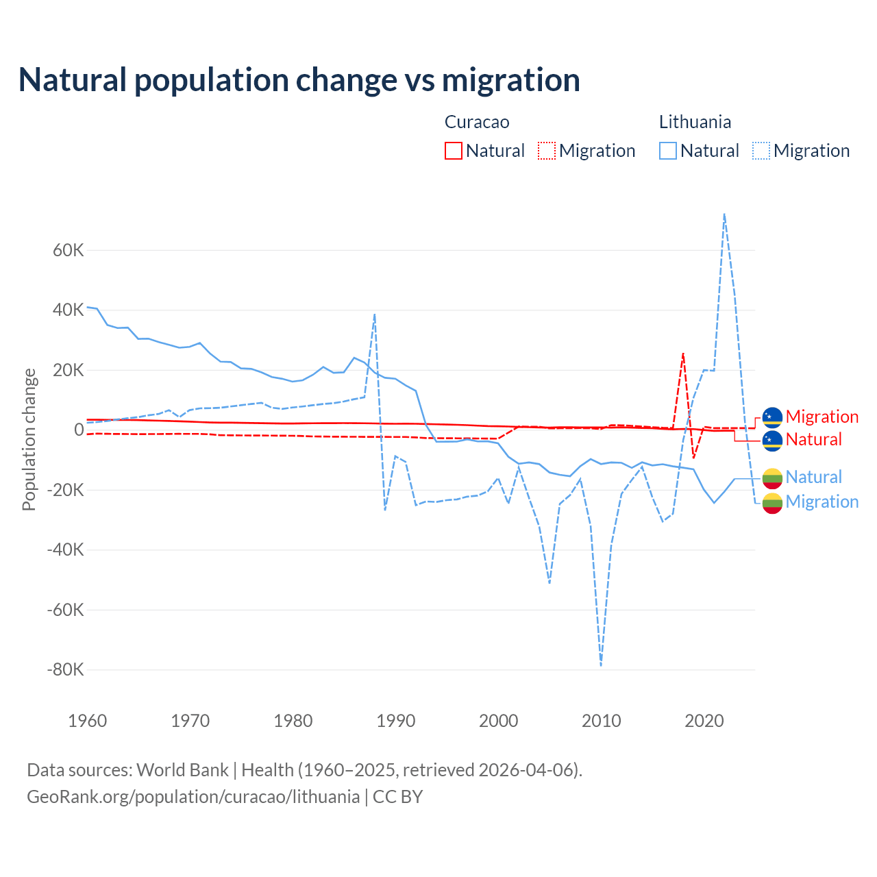 Over the last 10 years, 3.72% of the population change in Curacao is from natural causes (a gain of 834 people) and 96.3% is from migration (a gain of 21,615 people). In Lithuania 68.7% is from natural causes (a loss of 153,859 people) and 31.3% is from migration (a gain of 70,196 people).