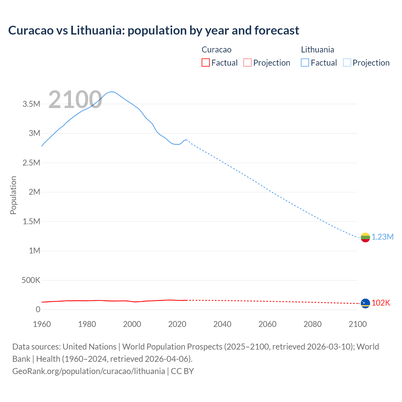 - Since 2006, the population of Curacao has increased from 141K people to 156K (10.4% growth), while Lithuania has declined from 3.27M to 2.83M (13.5% decline).