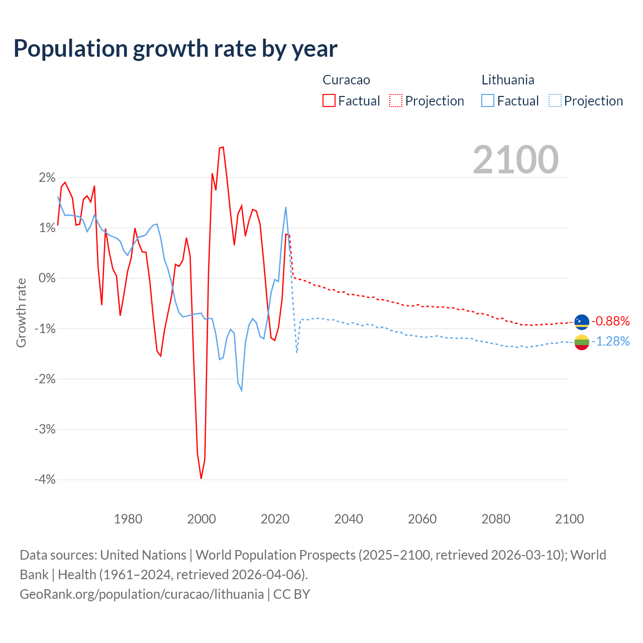 - For the last 10 years, Curacao has had an average growth rate of +0.13% per year vs -0.22% in Lithuania.