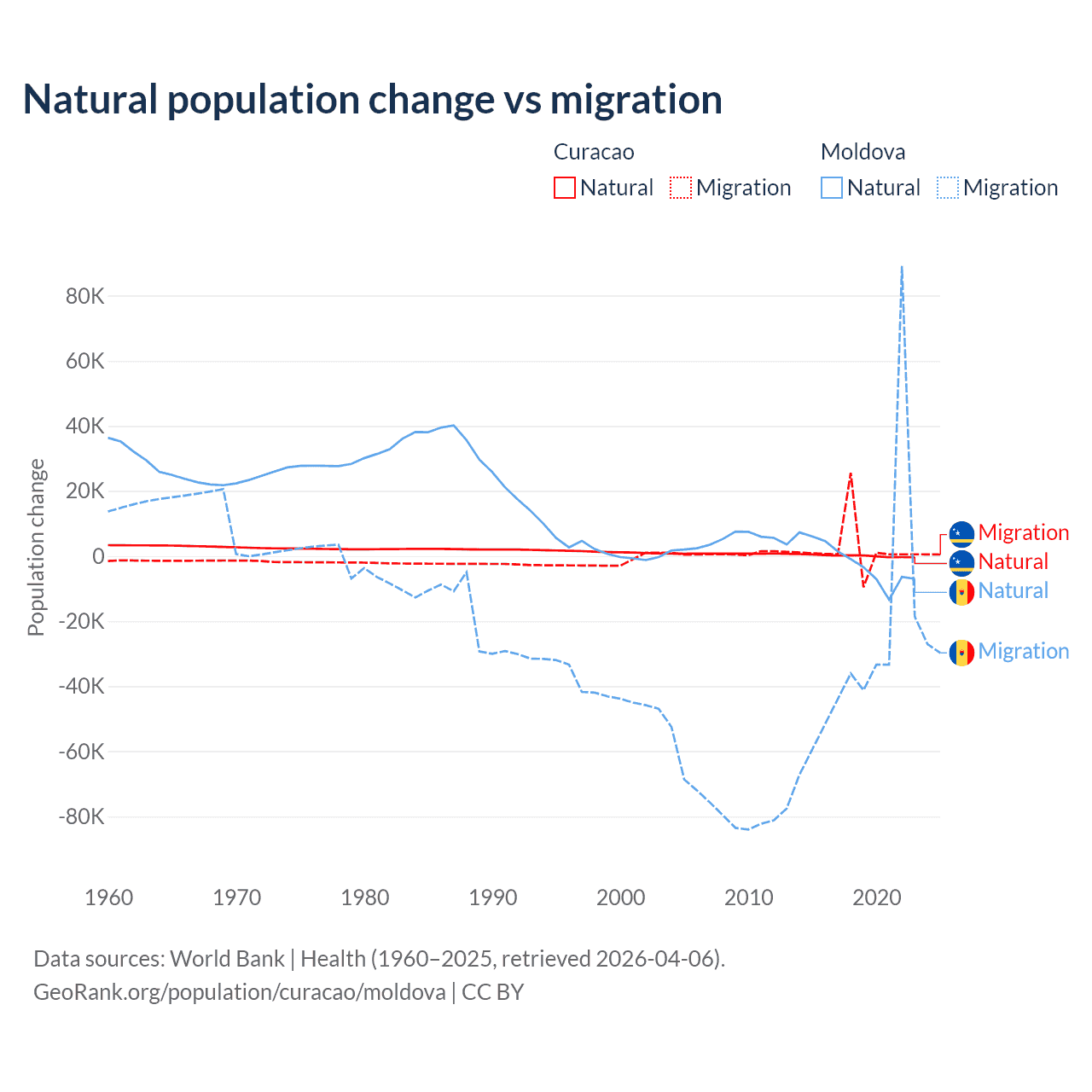 Over the last 10 years, 3.72% of the population change in Curacao is from natural causes (a gain of 834 people) and 96.3% is from migration (a gain of 21,615 people). In Moldova 6.04% is from natural causes (a loss of 19,001 people) and 94% is from migration (a loss of 295,631 people).