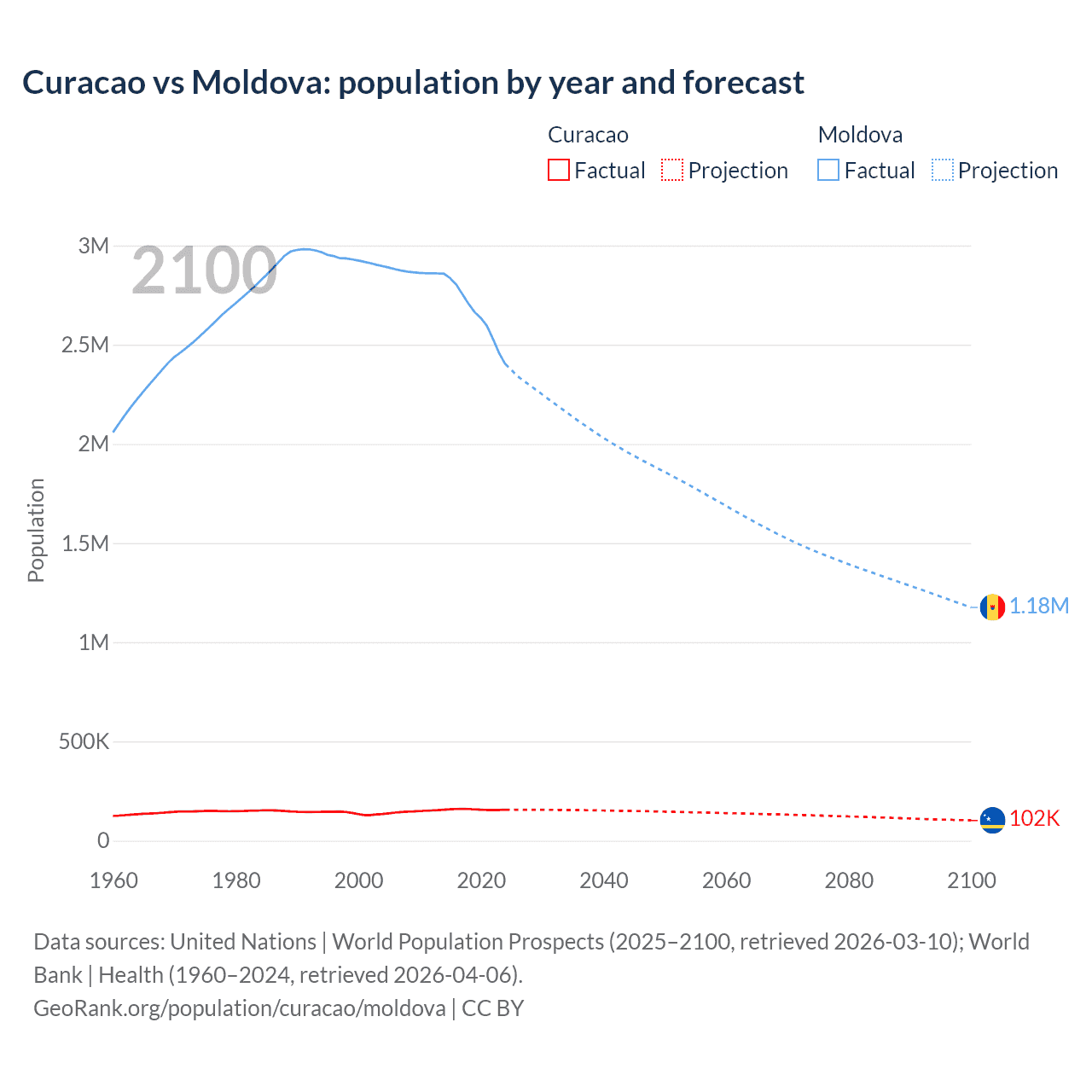 - Since 2006, the population of Curacao has increased from 141K people to 156K (10.4% growth), while Moldova has declined from 2.88M to 2.34M (18.7% decline).