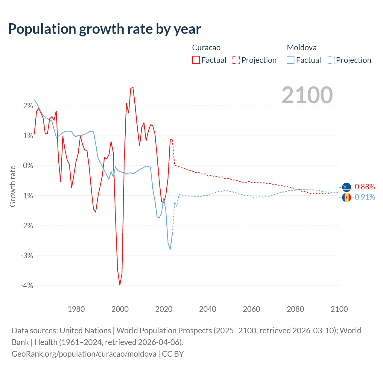 - For the last 10 years, Curacao has had an average growth rate of +0.13% per year vs -1.57% in Moldova.