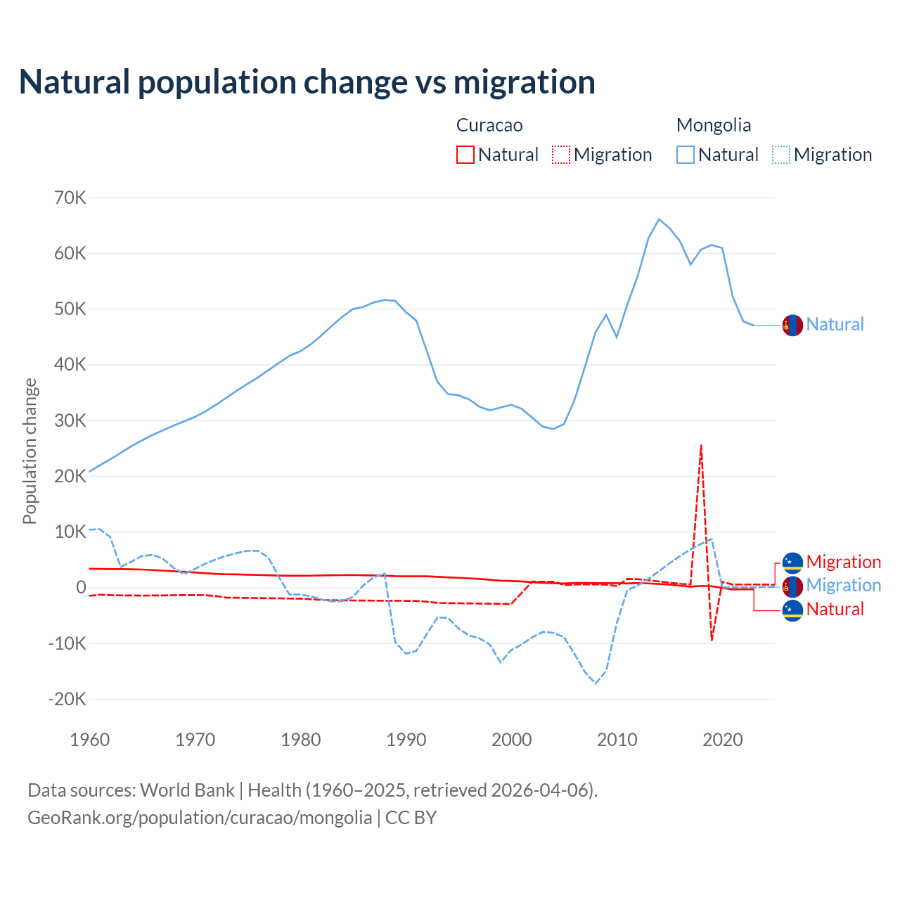 Over the last 10 years, 3.72% of the population change in Curacao is from natural causes (a gain of 834 people) and 96.3% is from migration (a gain of 21,615 people). In Mongolia 94.1% is from natural causes (a gain of 580,367 people) and 5.87% is from migration (a gain of 36,163 people).