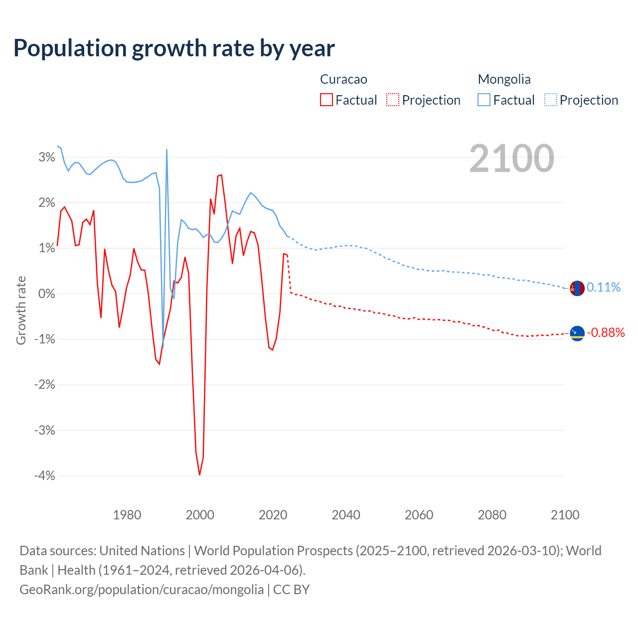 - For the last 10 years, Curacao has had an average growth rate of +0.13% per year vs +1.79% in Mongolia.