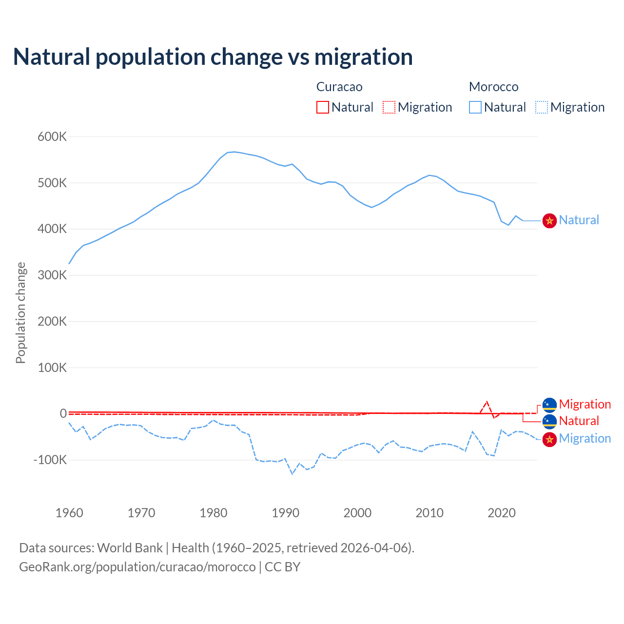 Over the last 10 years, 3.72% of the population change in Curacao is from natural causes (a gain of 834 people) and 96.3% is from migration (a gain of 21,615 people). In Morocco 88.3% is from natural causes (a gain of 4,495,223 people) and 11.7% is from migration (a loss of 594,083 people).