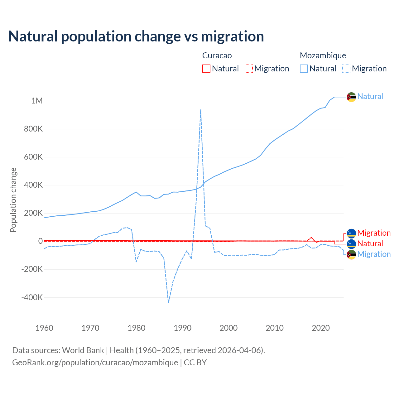 Over the last 10 years, 3.72% of the population change in Curacao is from natural causes (a gain of 834 people) and 96.3% is from migration (a gain of 21,615 people). In Mozambique 95.9% is from natural causes (a gain of 9,108,203 people) and 4.15% is from migration (a loss of 393,923 people).