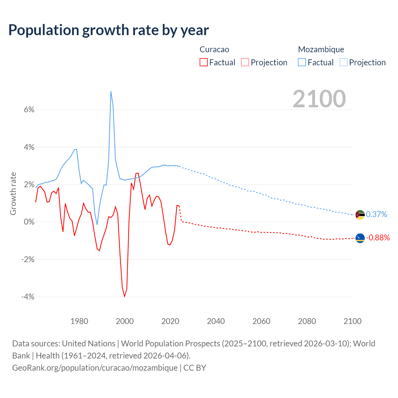 - For the last 10 years, Curacao has had an average growth rate of +0.13% per year vs +2.99% in Mozambique.