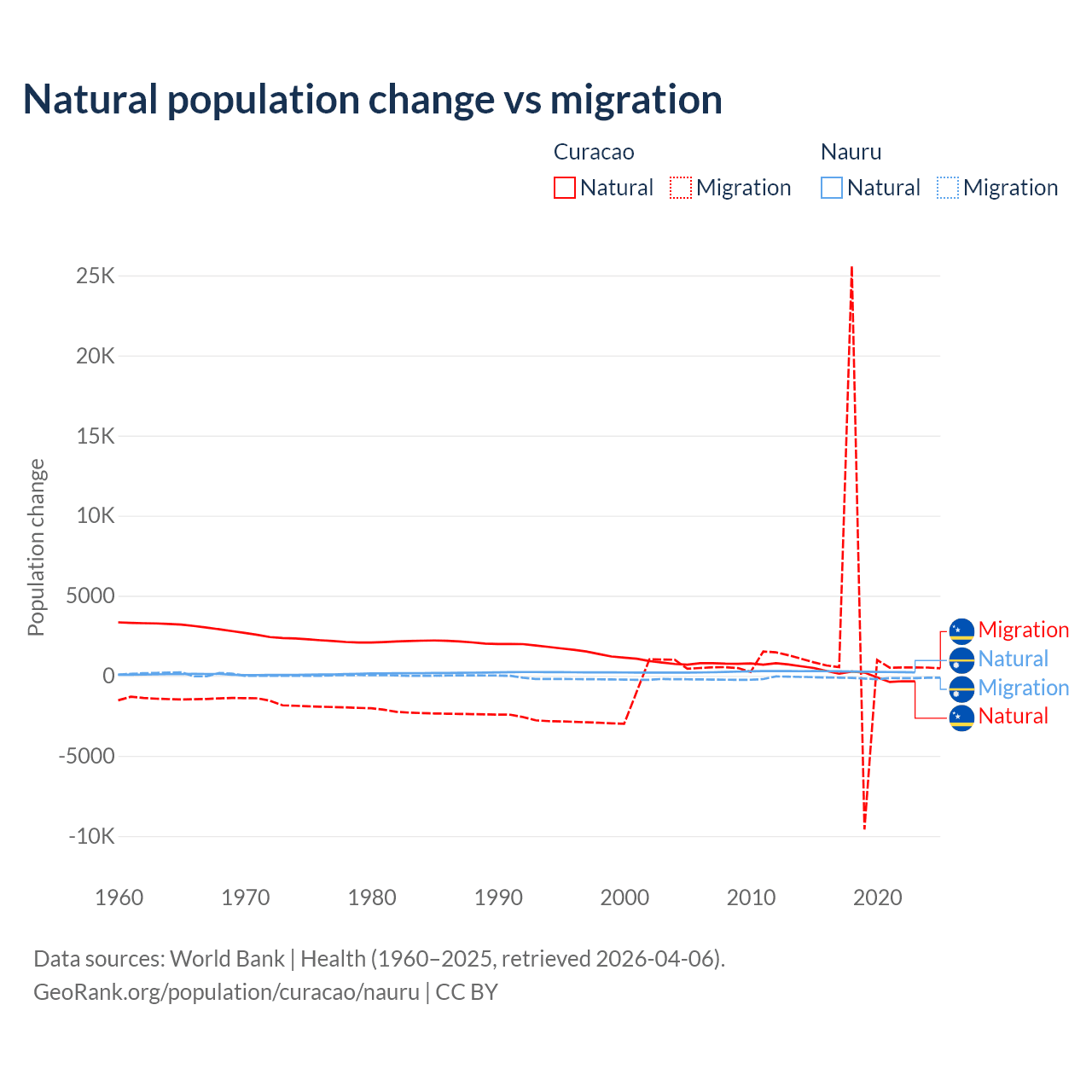 Over the last 10 years, 3.72% of the population change in Curacao is from natural causes (a gain of 834 people) and 96.3% is from migration (a gain of 21,615 people). In Nauru 66.2% is from natural causes (a gain of 2,590 people) and 33.8% is from migration (a loss of 1,320 people).