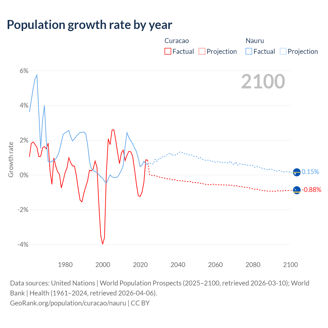 - For the last 10 years, Curacao has had an average growth rate of +0.13% per year vs +1.17% in Nauru.